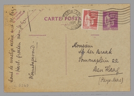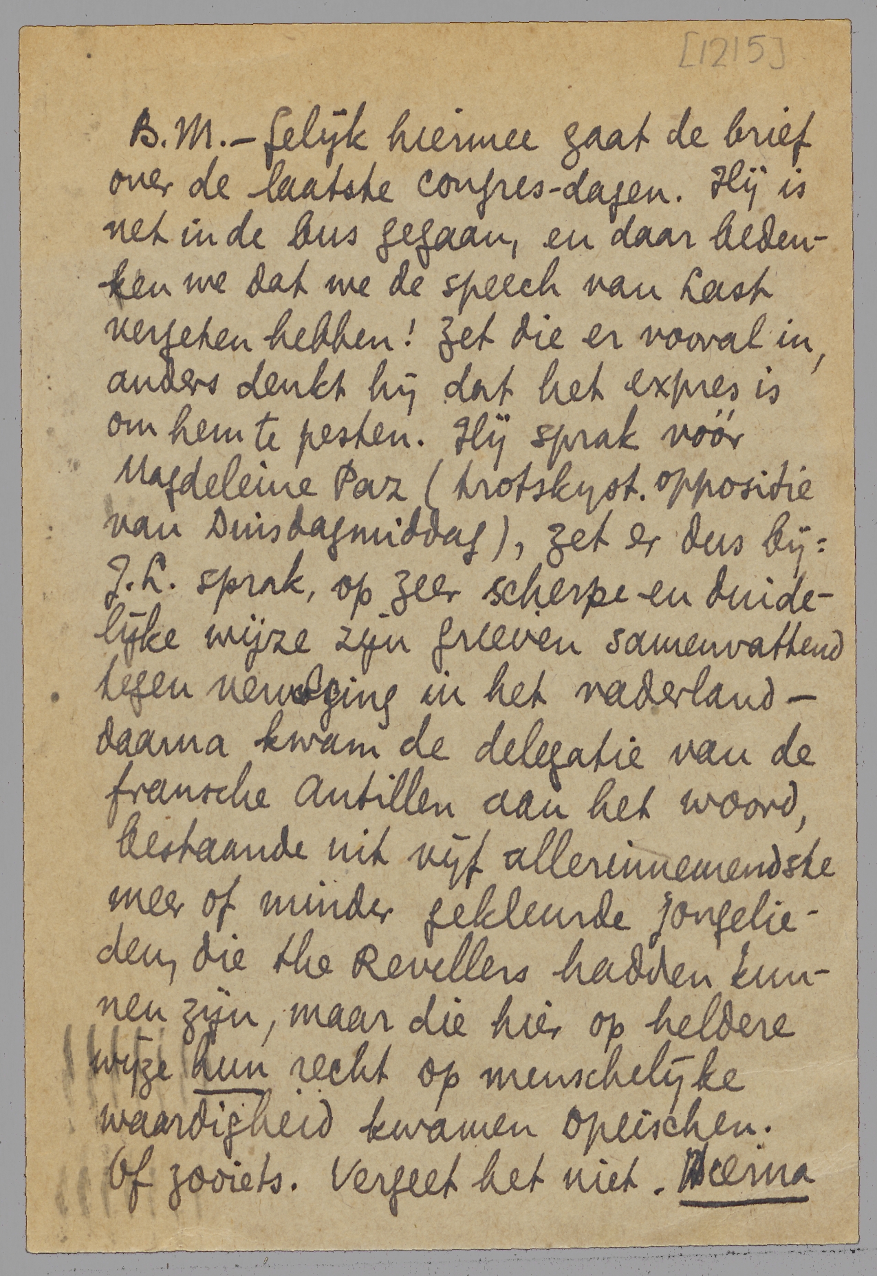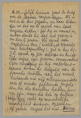 - Gelijk hiermee gaat de brief over de laatste congresdagen. Hij is net in de bus gegaan, en daar bedenken we dat we de speech van Last vergeten hebben! Zet die er vooral in, anders denkt hij dat het expres is om hem te pesten. Hij sprak vóór Magdeleine Paz (trotskyst. oppositie van Dinsdagmiddag), zet er dus bij: J.L. sprak, op zeer scherpe en duidelijke wijze zijn grieven samenvattend tegen vervolging in het vaderland - daarna kwam de delegatie van de fransche Antillen aan het woord, bestaande uit vijf allerinnemendste meer of minder gekleurde jongelieden, die the Revellers hadden kunnen zijn, maar die hier op heldere wijze hun recht op menschelijke waardigheid kwamen opeischen. Of zooiets. Vergeet het niet. Hierna komt de woelige scène met M. Paz.