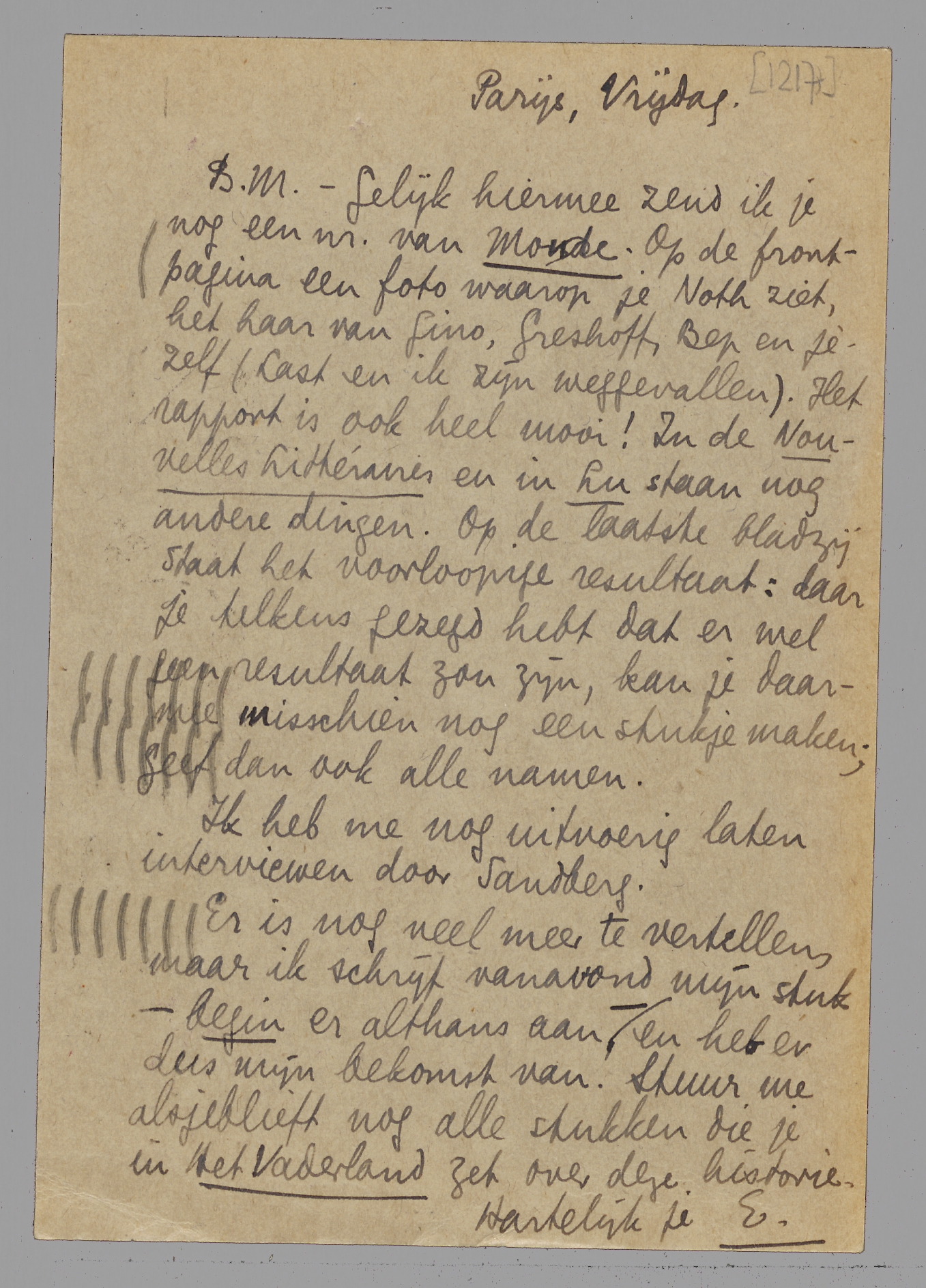 - Gelijk hiermee zend ik je nog een nr. van Monde. Op de frontpagina een foto waarop je Noth ziet, het haar van Gino, Greshoff, Bep en jezelf (Last en ik zijn weggevallen). Het rapport is ook heel mooi! In de Nouvelles Littéraires en in Lu staan nog andere dingen. Op de laatste bladzij staat het voorloopige resultaat: daar je telkens gezegd hebt dat er wel geen resultaat zou zijn, kan je daarmee misschien nog een stukje maken; geef dan ook alle namen.