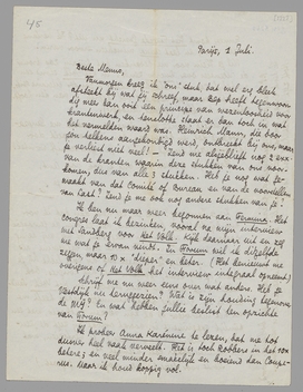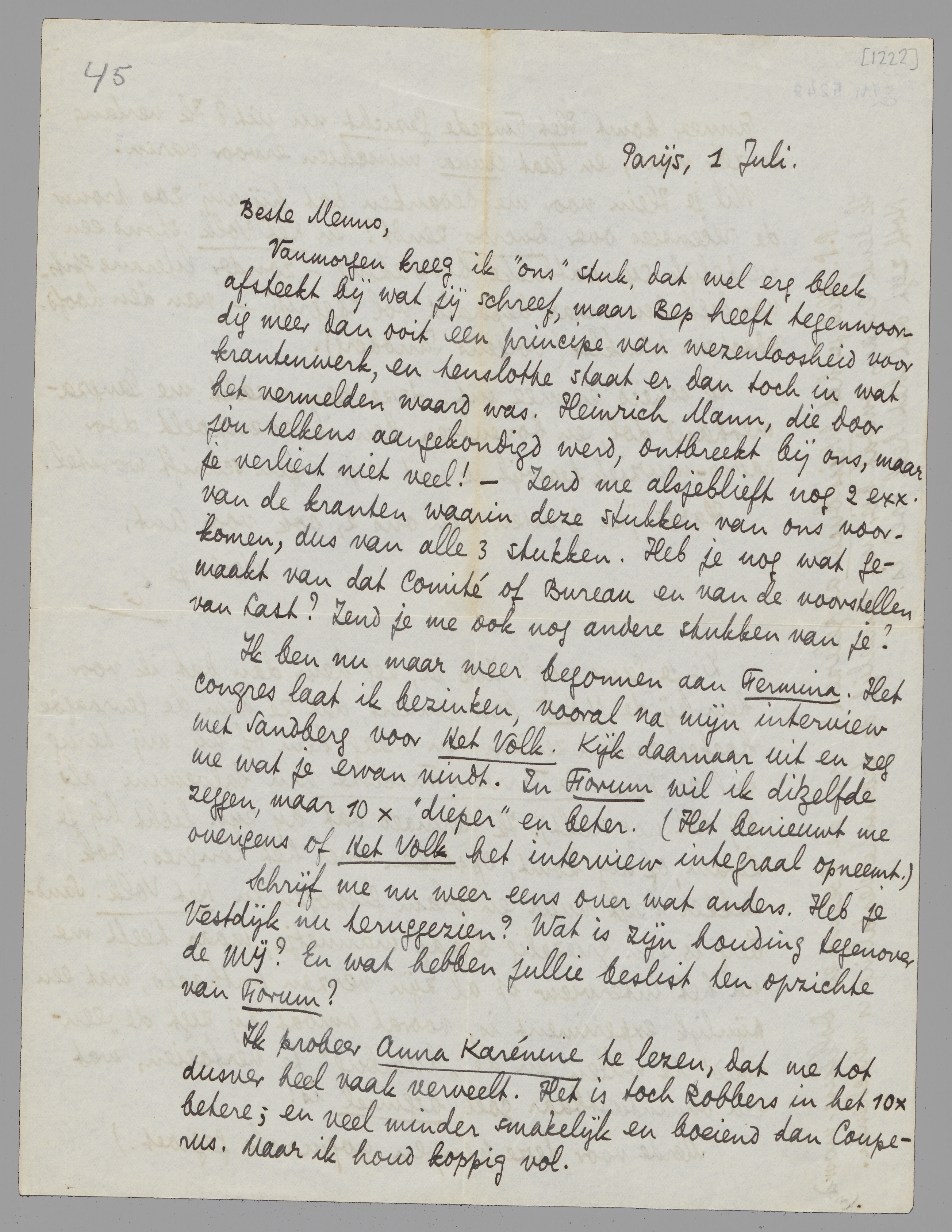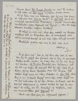 Vanmorgen kreeg ik ‘ons’ stuk, dat wel erg bleek afsteekt bij wat jij schreef, maar Bep heeft tegenwoordig meer dan ooit een principe van wezenloosheid voor krantenwerk, en tenslotte staat er dan toch in wat het vermelden waard was. Heinrich Mann, die door jou telkens aangekondigd werd, ontbreekt bij ons, maar je verliest niet veel! - Zend me alsjeblieft nog 2 exx. van de kranten waarin deze stukken van ons voorkomen, dus van alle 3 stukken. Heb je nog wat gemaakt van dat Comité of Bureau en van de voorstellen van Last? Zend je me ook nog andere stukken van je?
