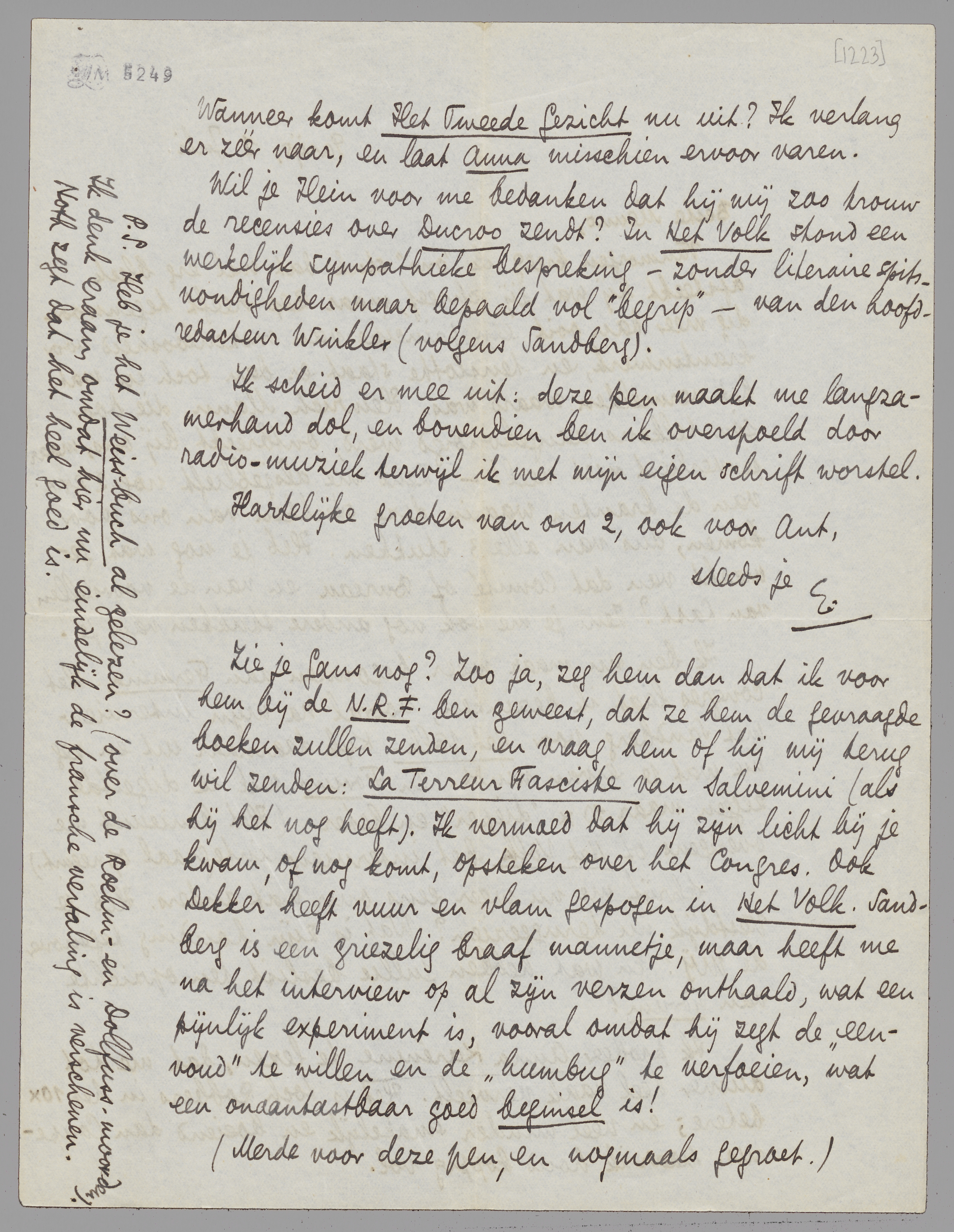 Wil je Hein voor me bedanken dat hij mij zoo trouw de recensies over Ducroo zendt? In Het Volk stond een werkelijk sympathieke bespreking - zonder literaire spitsvondigheden maar bepaald vol ‘begrip’ - van den hoofdredacteur Winkler (volgens Sandberg).