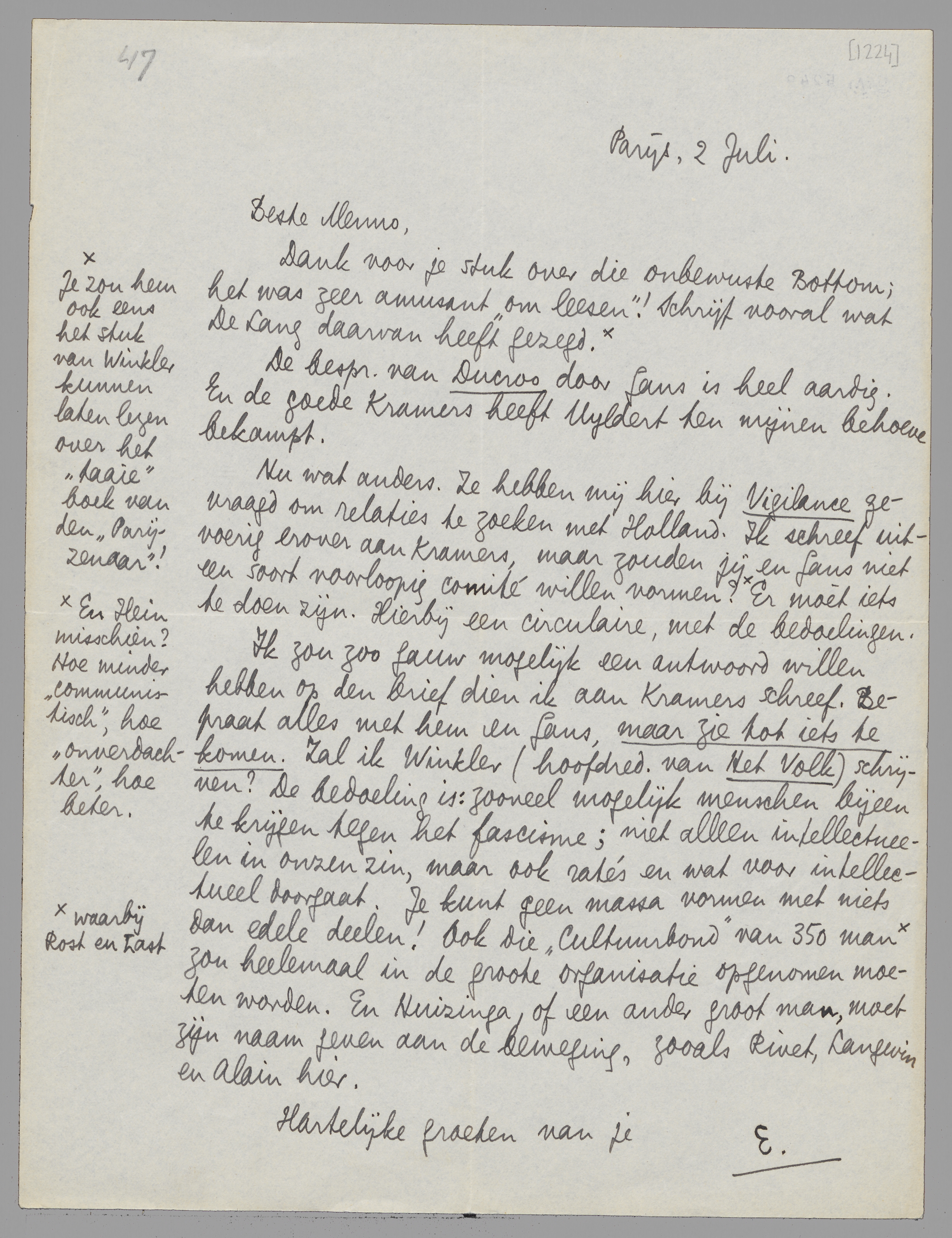 Ik zou zoo gauw mogelijk een antwoord willen hebben op den brief dien ik aan Kramers schreef. Bepraat alles met hem en Gans, maar zie tot iets te komen. Zal ik Winkler (hoofdred. van Het Volk) schrijven? De bedoeling is: zooveel mogelijk menschen bijeen te krijgen tegen het fascisme; niet alleen intellectueelen in onzen zin, maar ook ratés en wat voor intellectueel doorgaat. Je kunt geen massa vormen met niets dan edele deelen! Ook die ‘Cultuurbond’ van 350 man [waarbij Rost en Last] zou heelemaal in de groote organisatie opgenomen moeten worden. En Huizinga, of een ander groot man, moet zijn naam geven aan de beweging, zooals Rivet, Langevin en Alain hier.