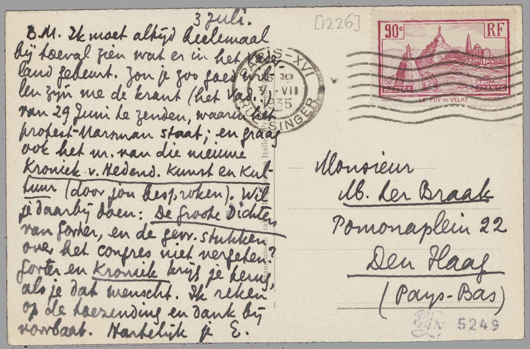 Ik moet altijd heelemaal bij toeval zien wat er in het Vaderland gebeurt. Zou je zoo goed willen zijn me de krant (het Vad.) van 29 Juni te zenden, waarin het protest-Marsman staat; en graag ook het nr. van die nieuwe Kroniek v. Hedend. Kunst en Kultuur (door jou besproken). Wil je daarbij doen: De Groote Dichters van Gorter, en de gevr. stukken over het congres niet vergeten? Gorter en Kroniek krijg je terug, als je dat wenscht. Ik reken op de toezending en dank bij voorbaat.