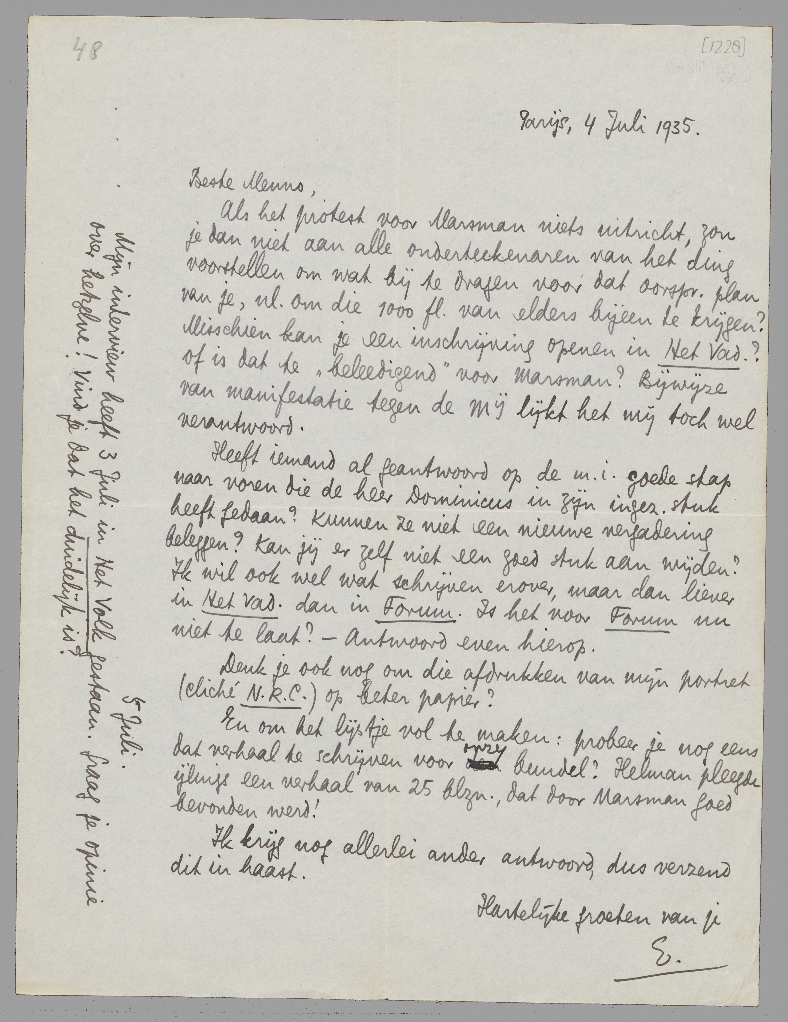 Als het protest voor Marsman niets uitricht, zou je dan niet aan alle onderteekenaren van het ding voorstellen om wat bij te dragen voor dat oorspr. plan van je, nl. om die fl. 1000 van elders bijeen te krijgen? Misschien kan je een inschrijving openen in Het Vad.? Of is dat te ‘beleedigend’ voor Marsman? Bijwijze van manifestatie tegen de Mij. lijkt het mij toch wel verantwoord.