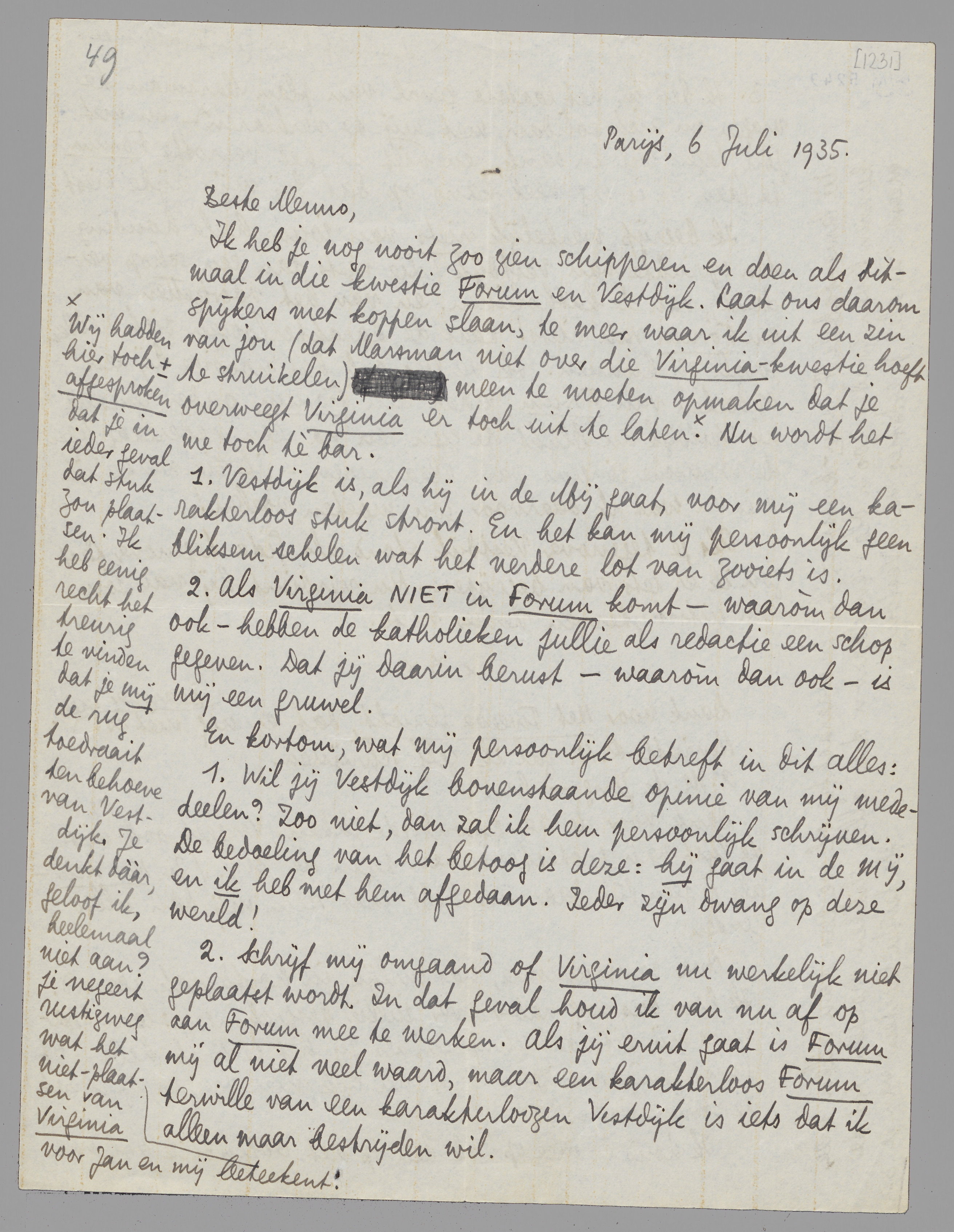 Ik heb je nog nooit zoo zien schipperen en doen als ditmaal in die kwestie Forum en Vestdijk. Laat ons daarom spijkers met koppen slaan, te meer waar ik uit een zin van jou (dat Marsman niet over die Virginia-kwestie hoeft te struikelen) meen te moeten opmaken dat je overweegt Virginia er toch uit te laten. [Wij hadden hier toch ± afgesproken dat je in ieder geval dat stuk zou plaatsen. Ik heb eenig recht het treurig te vinden dat je mij de rug toedraait ten behoeve van Vestdijk. Je denkt dààr geloof ik heelemaal niet aan? je negeert rustigweg wat het niet-plaatsen van Virginia voor Jan en mij beteekent.] Nu wordt het me toch tè bar.