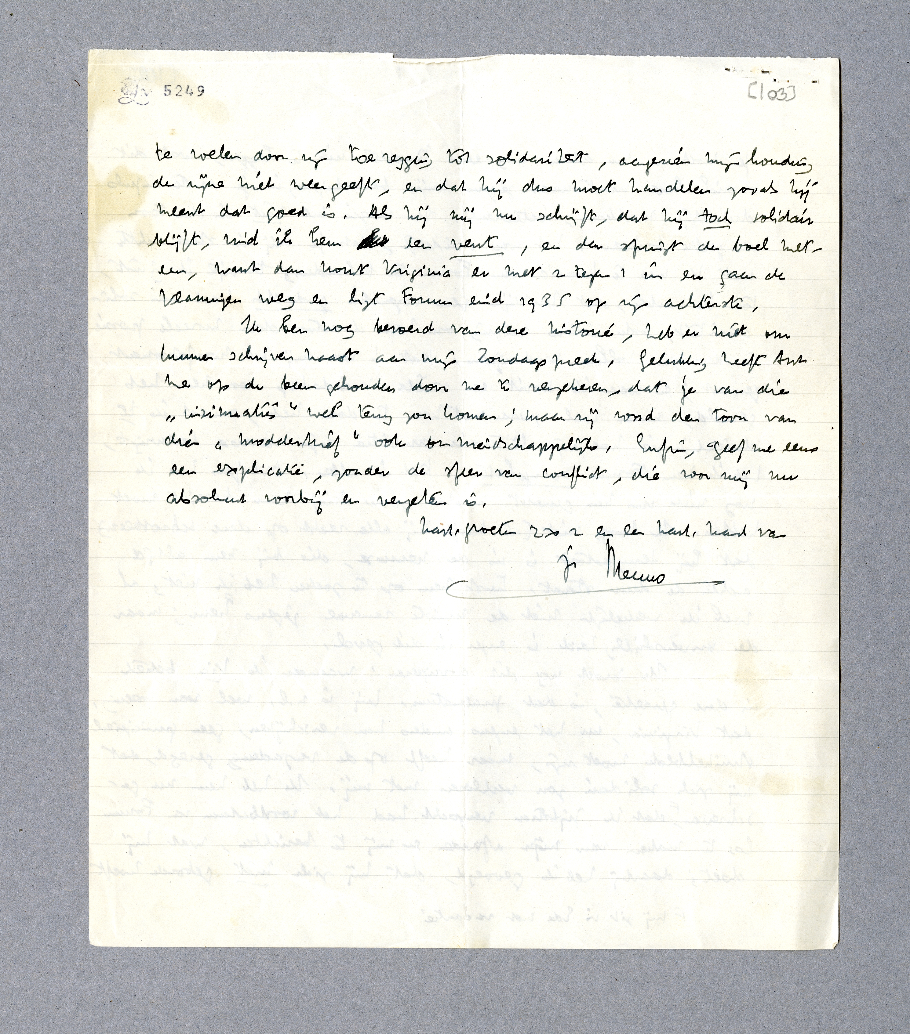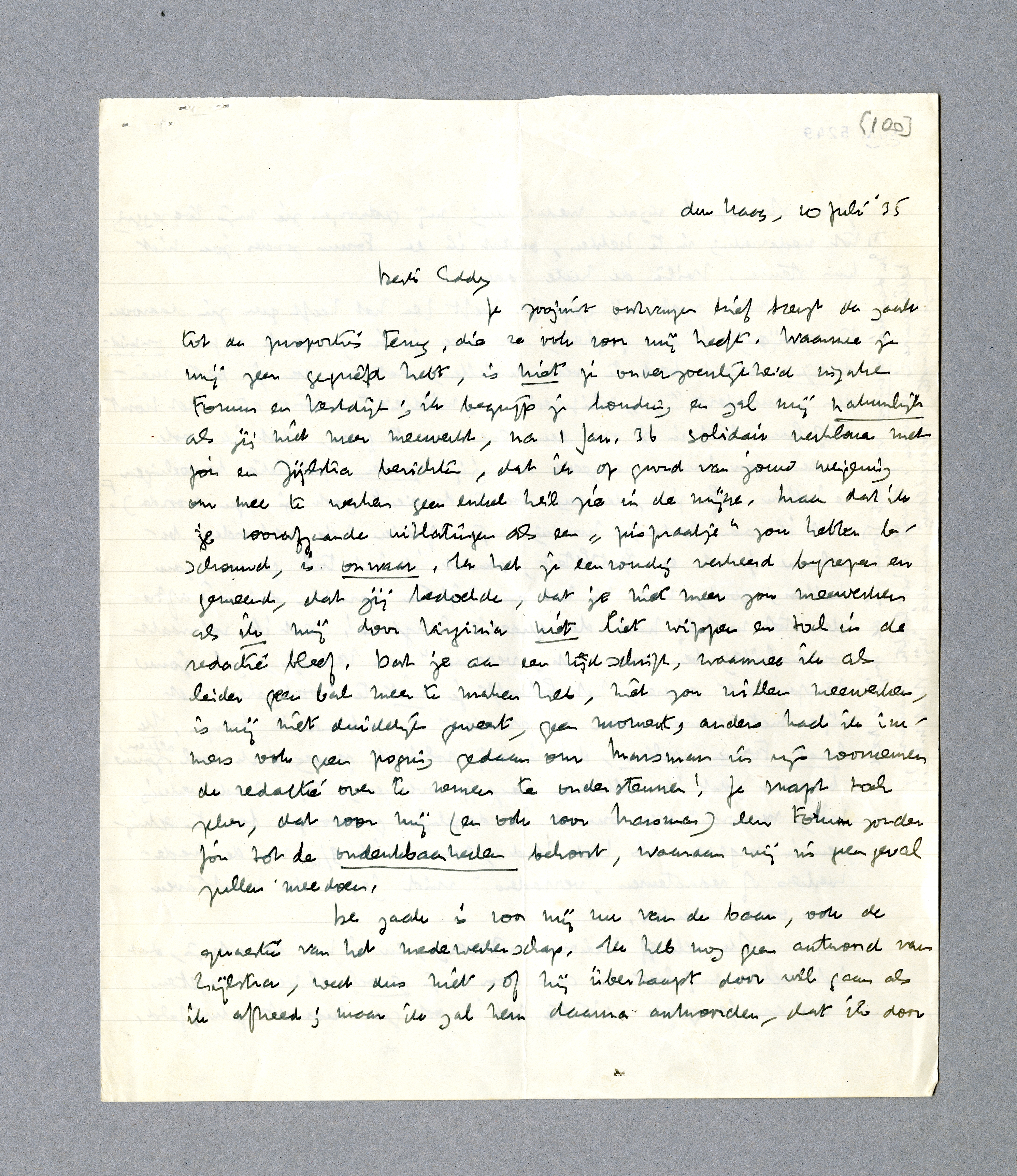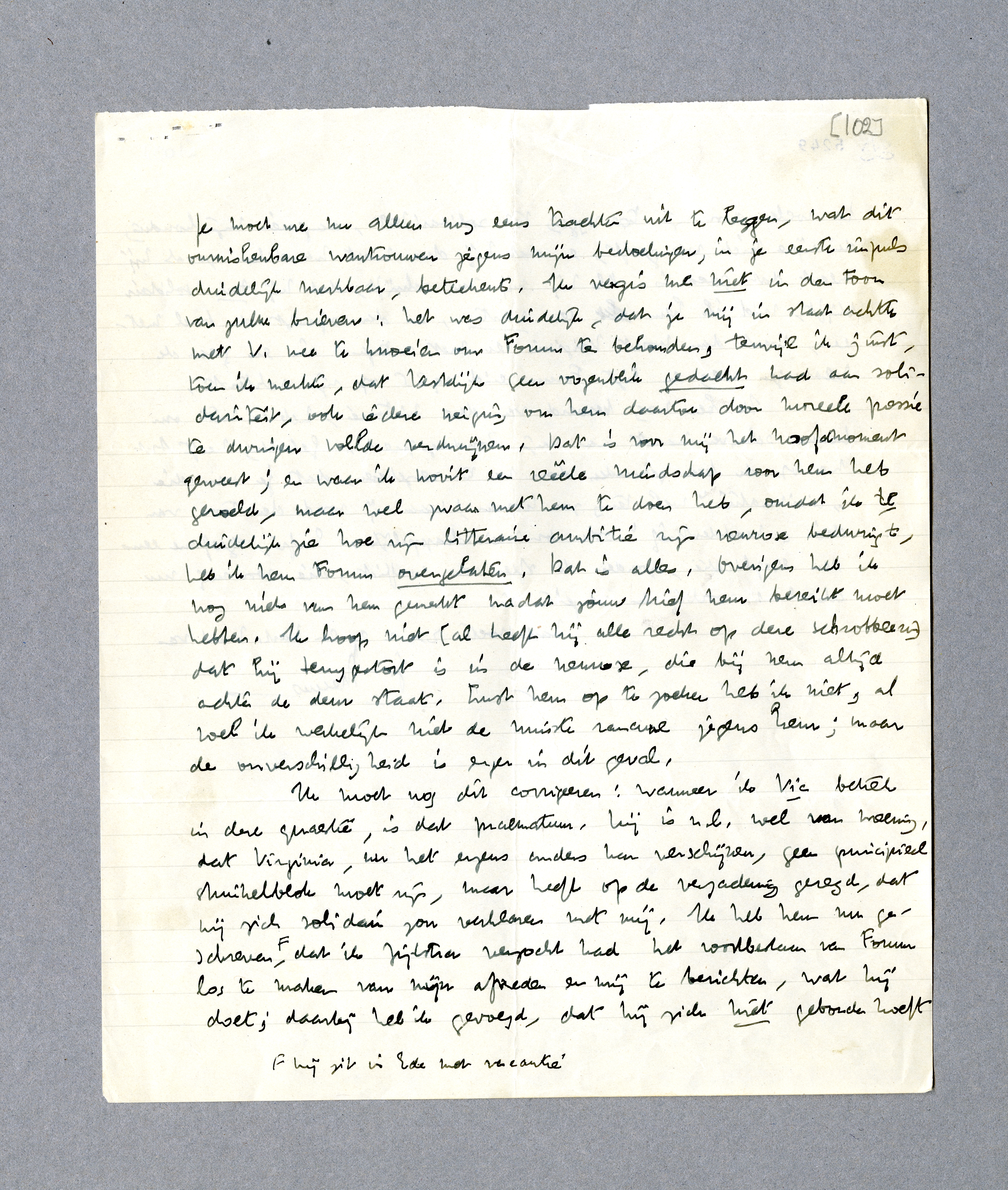 Ik moet nog dit corrigeeren: wanneer ik Vic betrek in deze quaestie, is dat praematuur. Hij is n.l. wel van meening, dat Virginia, nu het ergens anders kan verschijnen, geen principieel struikelblok moet zijn, maar heeft op de vergadering gezegd, dat hij zich solidair zou verklaren met mij. Ik heb hem nu geschreven [hij zit in Ede met vacantie], dat ik Zijlstra verzocht had het voortbestaan van Forum los te maken van mijn aftreden en mij te berichten, wat hij doet; daarbij heb ik gevoegd, dat hij zich niet gebonden hoeft te voelen door zijn toezegging tot solidariteit, aangezien mijn houding de zijne niet weergeeft, en dat hij dus moet handelen zooals hij meent dat goed is. Als hij mij nu schrijft, dat hij toch solidair blijft, vind ik hem een vent, en dan springt de boel meteen, want dan komt Virginia er met 2 tegen 1 in en gaan de Vlamingen weg en ligt Forum eind 1935 op zijn achterste.