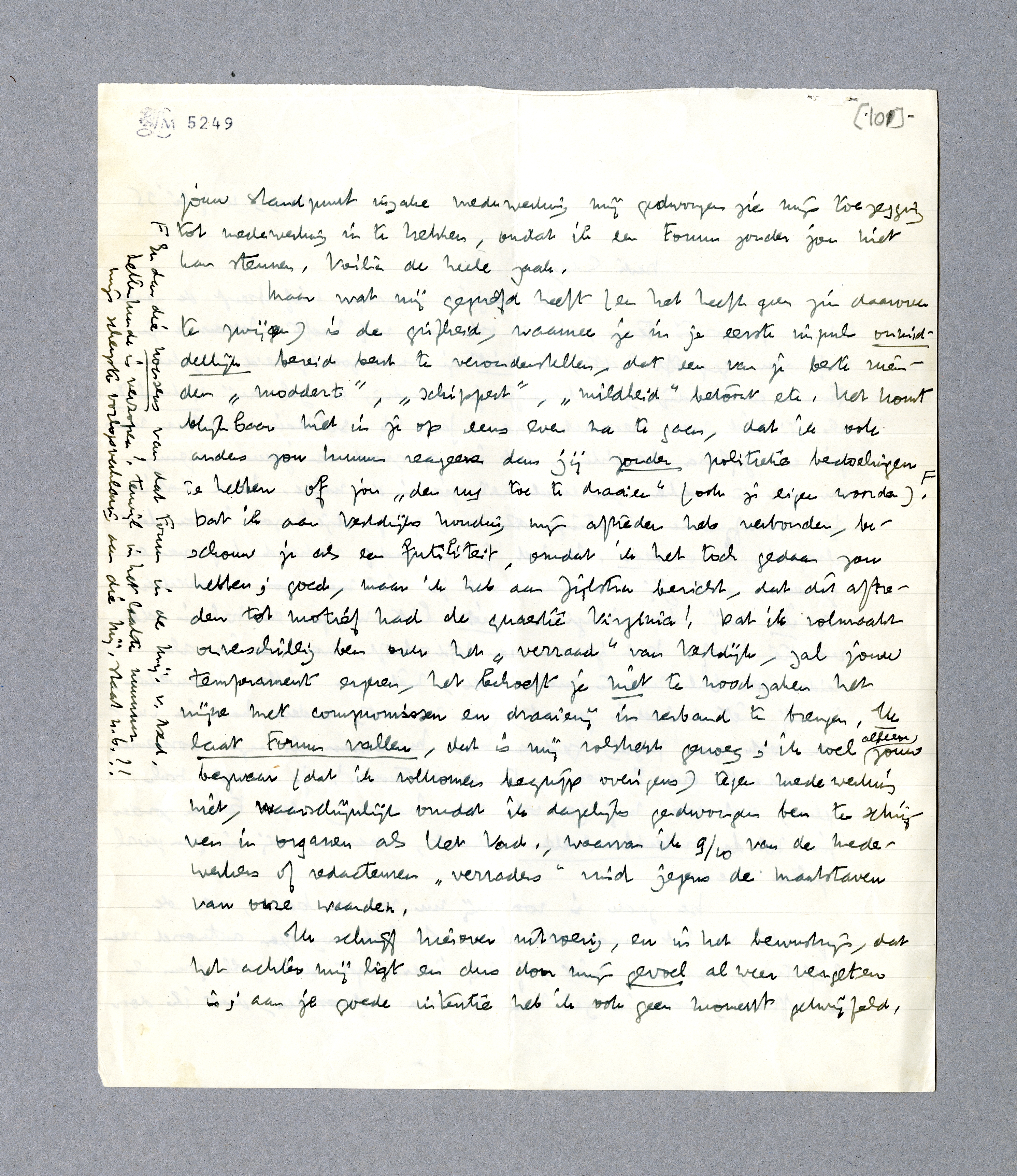 Maar wat mij gegriefd heeft (en het heeft geen zin daarover te zwijgen) is de grifheid, waarmee je in je eerste impuls onmiddellijk bereid bent te veronderstellen, dat een van je beste vrienden ‘moddert’, ‘schippert’, ‘mildheid’ betoont etc. Het komt blijkbaar niet in je op eens even na te gaan, dat ik ook anders zou kunnen reageeren dan jij zonder politieke bedoelingen te hebben of jou ‘den rug toe te draaien’ (ook je eigen woorden). [En dan die nonsens van dat Forum in de Mij. v. Ned. Letterkunde is verzopen! Terwijl in het laatste nummer mijn scherpste oorlogsverklaring aan die Mij. staat n.b.!!] Dat ik aan Vestdijks houding mijn aftreden heb verbonden, beschouw je als een futiliteit, omdat ik het toch gedaan zou hebben; goed, maar ik heb aan Zijlstra bericht, dat dit aftreden tot motief had de quaestie Virginia! Dat ik volmaakt onverschillig ben over het ‘verraad’ van Vestdijk, zal jouw temperament ergeren, het behoeft je niet te noodzaken het mijne met compromissen en draaierij in verband te brengen. Ik laat Forum vallen, dat is mij volstrekt genoeg; ik voel alleen jouw bezwaar (dat ik volkomen begrijp overigens) tegen medewerking niet, waarschijnlijk omdat ik dagelijks gedwongen ben te schrijven in organen als Het Vad., waarvan ik 9/10 van de medewerkers of redacteuren ‘verraders’ vind jegens de maatstaven van onze waarden.