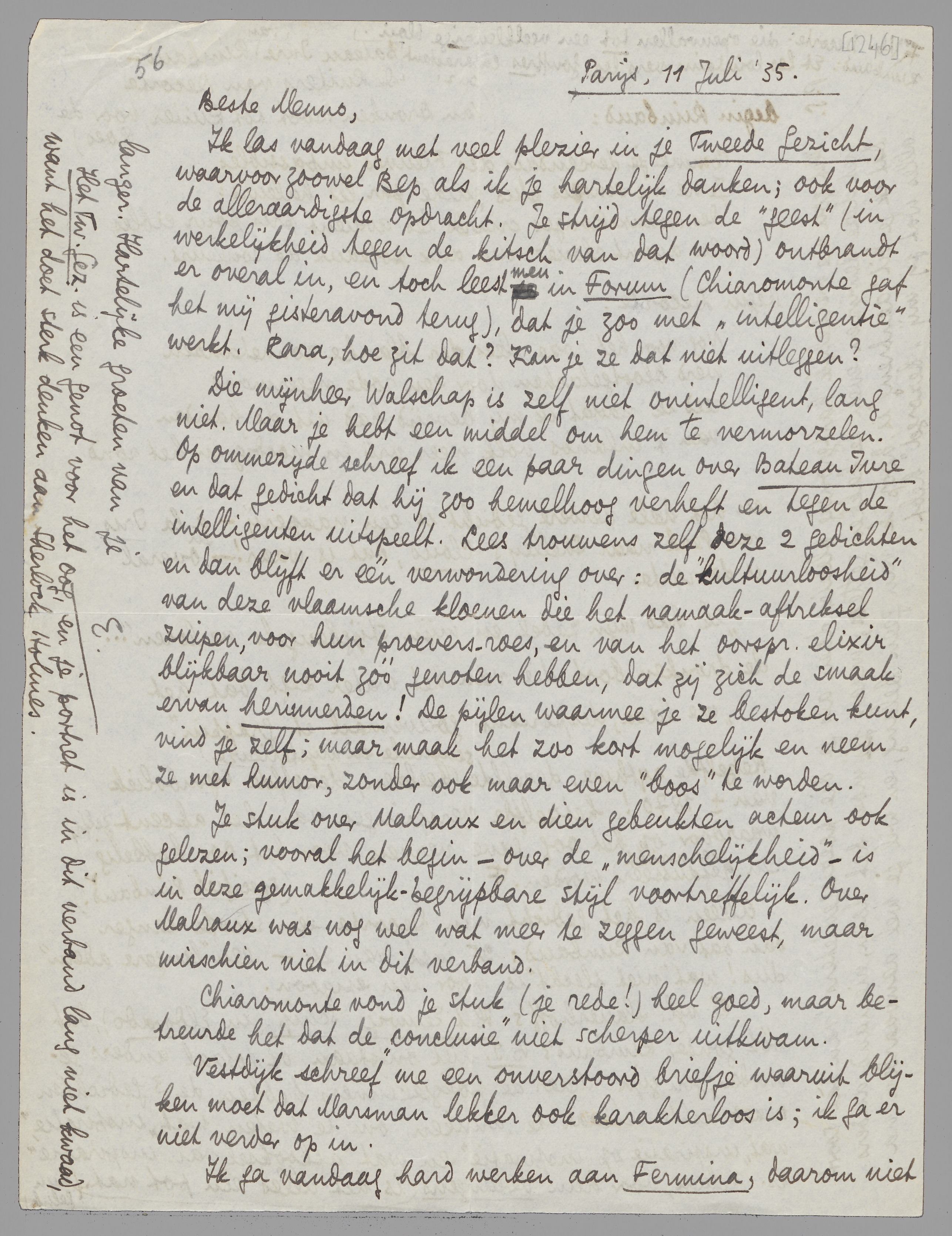 Ik las vandaag met veel plezier in je Tweede Gezicht, waarvoor zoowel Bep als ik je hartelijk danken; ook voor de alleraardigste opdracht. Je strijd tegen de ‘geest’ (in werkelijkheid tegen de kitsch van dat woord) ontbrandt er overal in, en toch leest men in Forum (Chiaromonte gaf het mij gisteravond terug), dat je zoo met ‘intelligentie’ werkt. Rara, hoe zit dat? Kan je ze dat niet uitleggen?