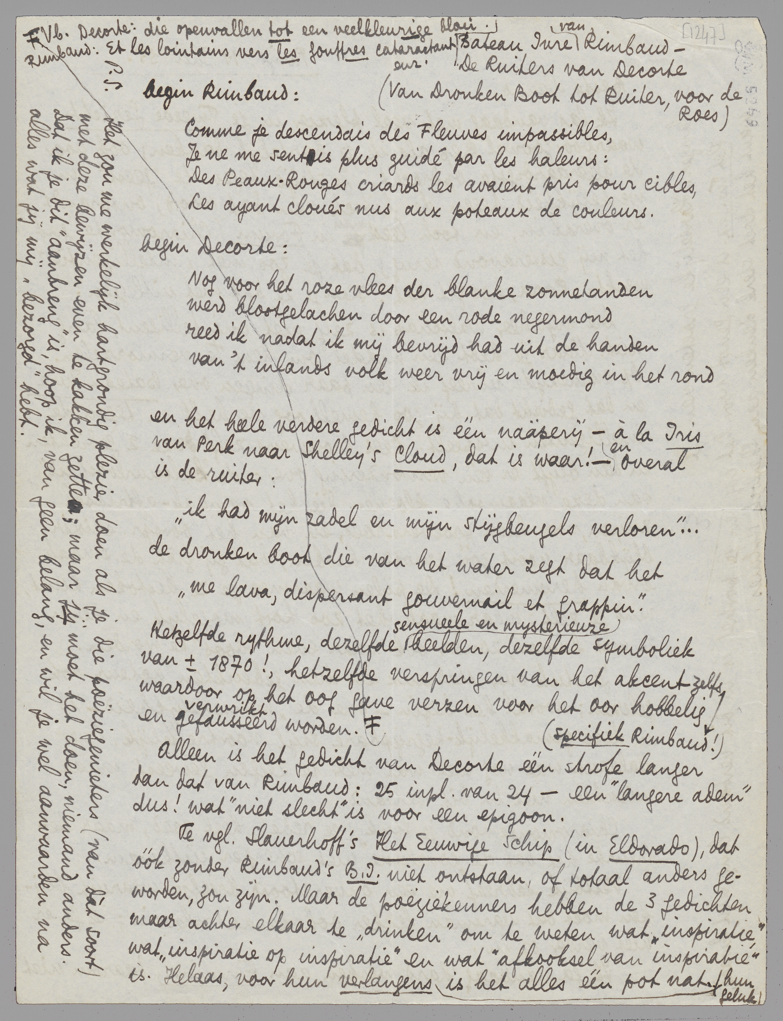 Hetzelfde rythme, dezelfde sensueele en mysterieuze beelden, dezelfde symboliek van ± 1870!, hetzelfde verspringen van het akcent zelfs (specifiek Rimbaud!) waardoor op het oog gave verzen voor het oor hobbelig en verwrikt, gefausseerd worden. Vb. Decorte: die openvallen tot een veelkleurige bloei. Rimbaud: Et les lointains vers les gouffres cataractant enz. Alleen is het gedicht van Decorte één strofe langer dan dat van Rimbaud: 25 inpl. van 24 - een ‘langere adem’ dus! wat ‘niet slecht’ is voor een epigoon.