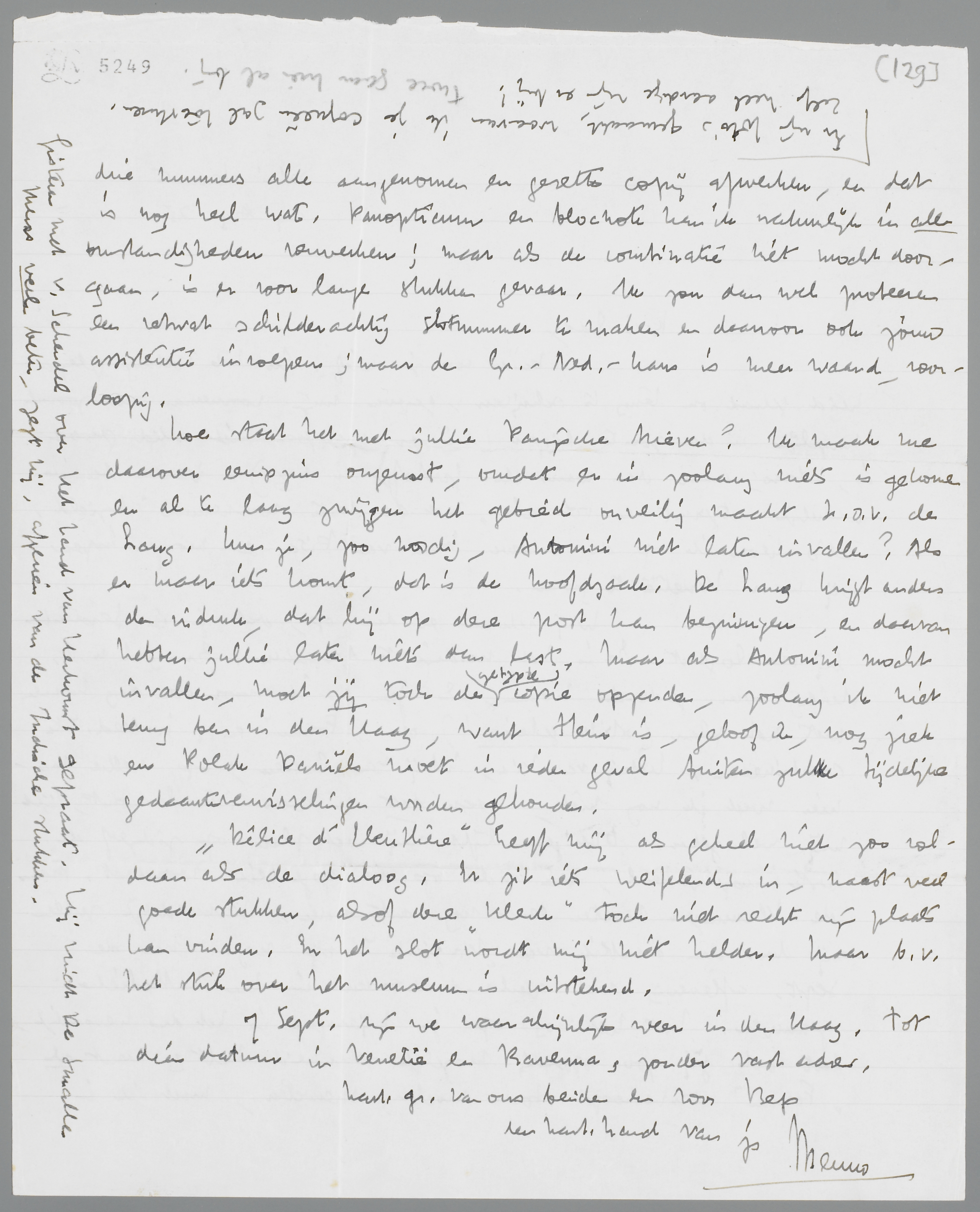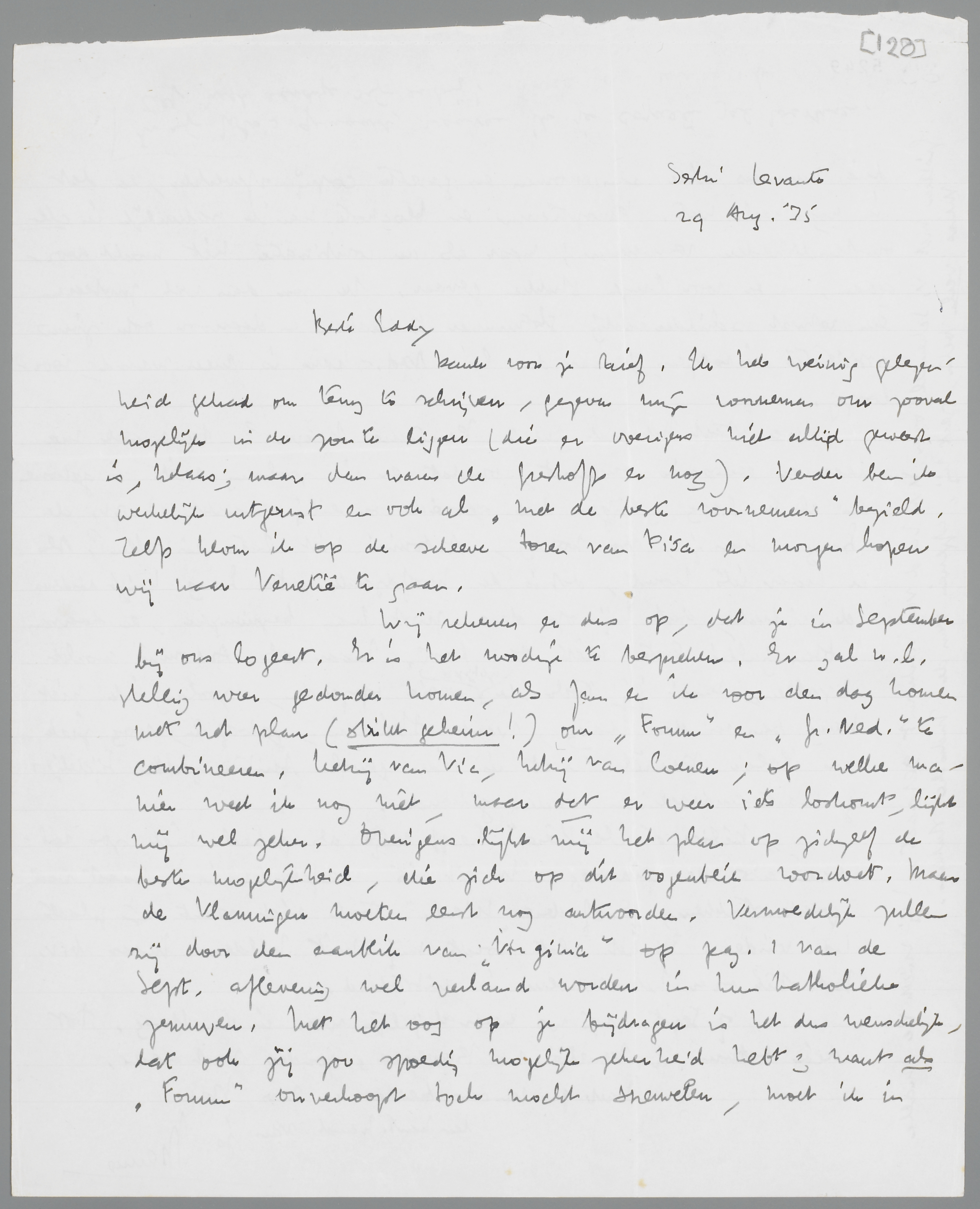 Hoe staat het met jullie Parijsche brieven? Ik maak me daarover eenigszins ongerust, omdat er in zoolang niets is gekomen en al te lang zwijgen het gebied onveilig maakt t.o.v. de Lang. Kun je, zoo noodig, Antonini niet laten invallen? Als er maar iets komt, dat is de hoofdzaak. De Lang krijgt anders de indruk, dat hij op deze post kan bezuinigen, en daarvan hebben jullie later niets dan last. Maar als Antonini mocht invallen, moet jij toch de getypte copie opzenden, zoolang ik niet terug ben in den Haag, want Hein is, geloof ik, nog ziek en Polak Daniëls moet in ieder geval buiten zulke tijdelijke gedaanteverwisselingen worden gehouden.