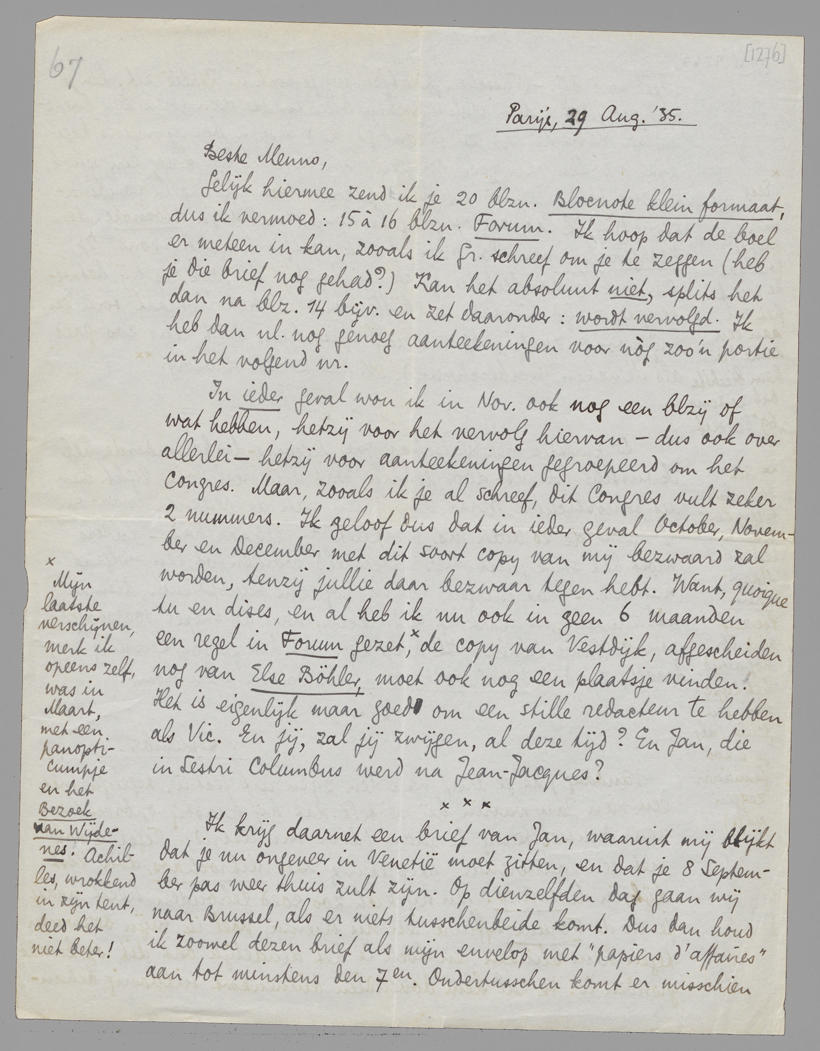 In ieder geval wou ik in Nov. ook nog een blzij of wat hebben, hetzij voor het vervolg hiervan - dus ook over allerlei - hetzij voor aanteekeningen gegroepeerd om het Congres. Maar, zooals ik je al schreef, dit Congres vult zeker 2 nummers. Ik geloof dus dat in ieder geval October, November en December met dit soort copy van mij bezwaard zal worden, tenzij jullie daar bezwaar tegen hebt. Want, quoique tu en dises, en al heb ik nu ook in geen 6 maanden een regel in Forum gezet, [Mijn laatste verschijnen merk ik opeens zelf, was in Maart, met een panopticumpje en het Bezoek van Wijdenes. Achilles, wrokkend in zijn tent, deed het niet beter!] de copy van Vestdijk, afgescheiden nog van Else Böhler, moet ook nog een plaatsje vinden.