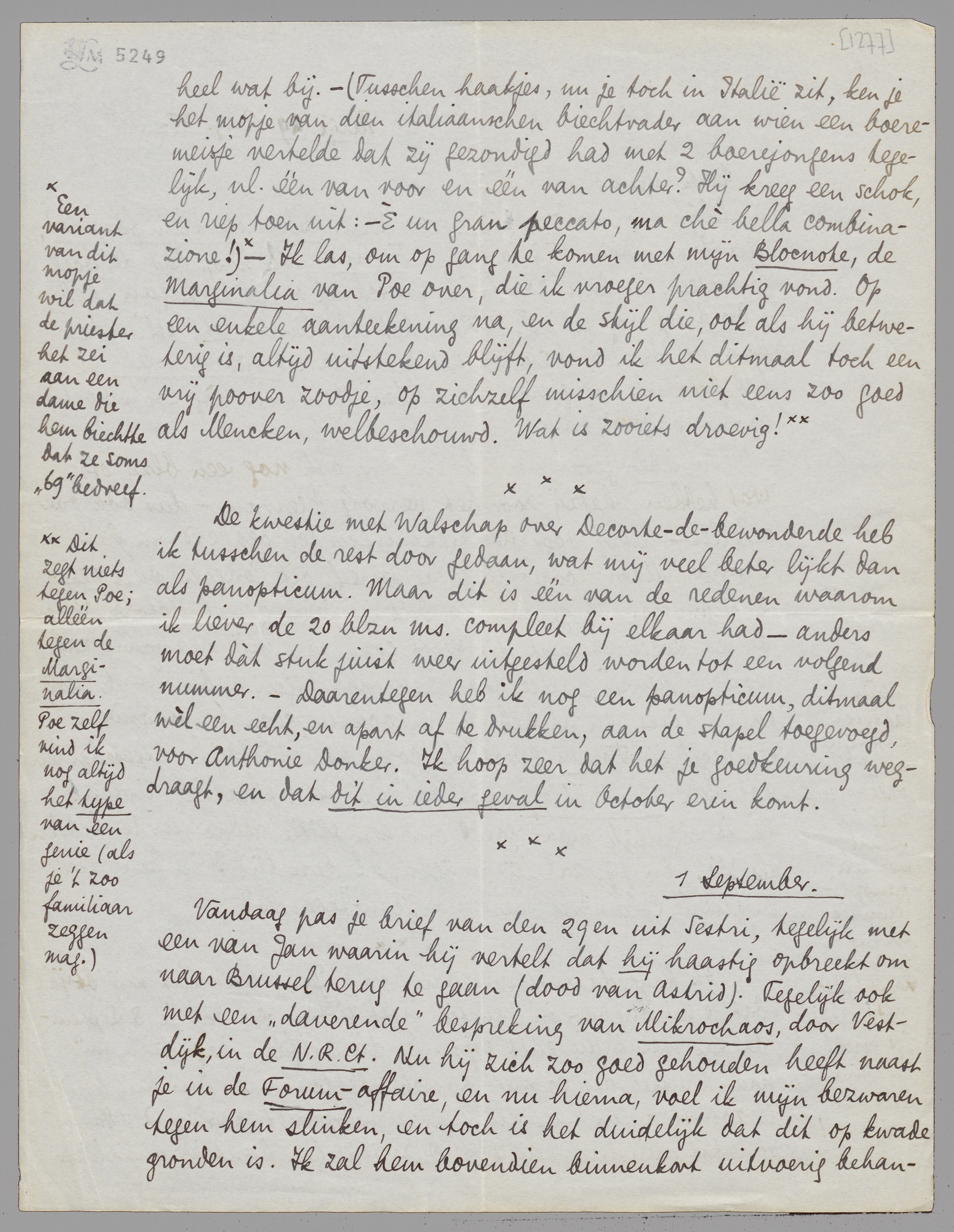Ik krijg daarnet een brief van Jan, waaruit mij blijkt dat je nu ongeveer in Venetië moet zitten, en dat je 8 September pas weer thuis zult zijn. Op dienzelfden dag gaan wij naar Brussel, als er niets tusschenbeide komt. Dus dan houd ik zoowel dezen brief als mijn envelop met ‘papier d'affaires’ aan tot minstens den 7en. Ondertusschen komt er misschien heel wat bij. - (Tusschen haakjes, nu je toch in Italië zit, ken je het mopje van dien italiaanschen biechtvader aan wien een boeremeisje vertelde dat zij gezondigd had met 2 boerejongens tegelijk, nl. één van voor en één van achter? Hij kreeg een schok, en riep toen uit: - È un gran peccato, ma chè bella combinazione!) - [Een variant van dit mopje wil dat de priester het zei aan een dame die hem biechtte dat zij soms ‘69’ bedreef.] Ik las, om op gang te komen met mijn Blocnote, de Marginalia van Poe over, die ik vroeger prachtig vond. Op een enkele aanteekening na, en de stijl die, ook als hij betweterig is, altijd uitstekend blijft, vond ik het ditmaal toch een vrij poover zoodje, op zich zelf misschien niet eens zoo goed als Mencken, welbeschouwd. Wat is zoo iets droevig! [Dit zegt niets tegen Poe; alléén tegen de Marginalia. Poe zelf vind ik nog altijd het type van een genie (als je 't zoo familiaar zeggen mag.)]