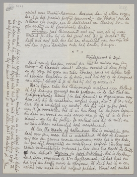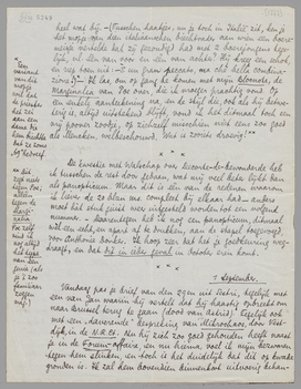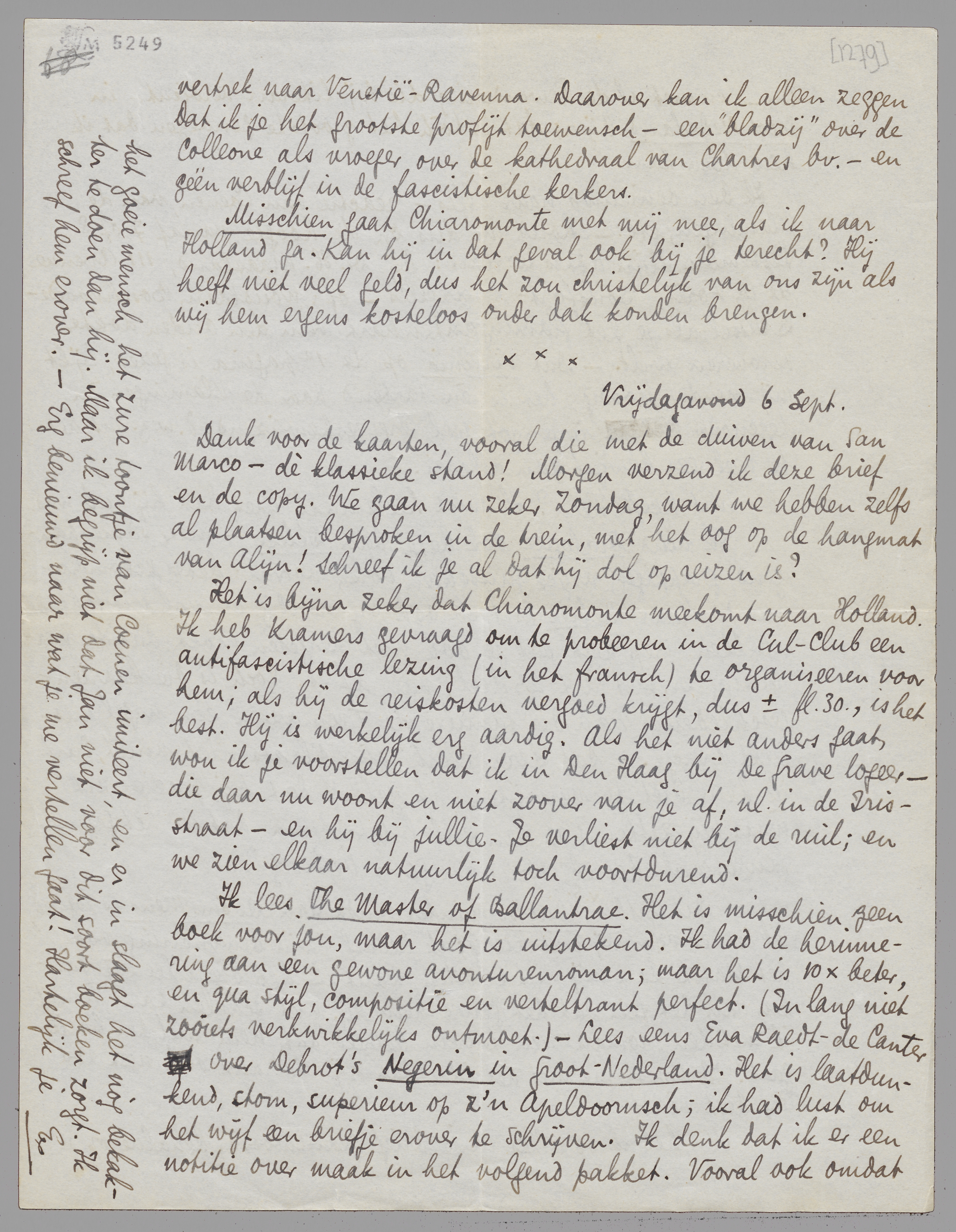 Het is bijna zeker dat Chiaromonte meekomt naar Holland. Ik heb Kramers gevraagd om te probeeren in de Cul-Club een antifascistische lezing (in het fransch) te organiseeren voor hem; als hij de reiskosten vergoed krijgt, dus ± fl. 30., is het best. Hij is werkelijk erg aardig. Als het niet anders gaat, wou ik je voorstellen dat ik in Den Haag bij De Grave logeer - die daar nu woont en niet zoover van je af, nl. in de Irisstraat - en hij bij jullie. Je verliest niet bij de ruil; en we zien elkaar natuurlijk toch voortdurend.