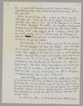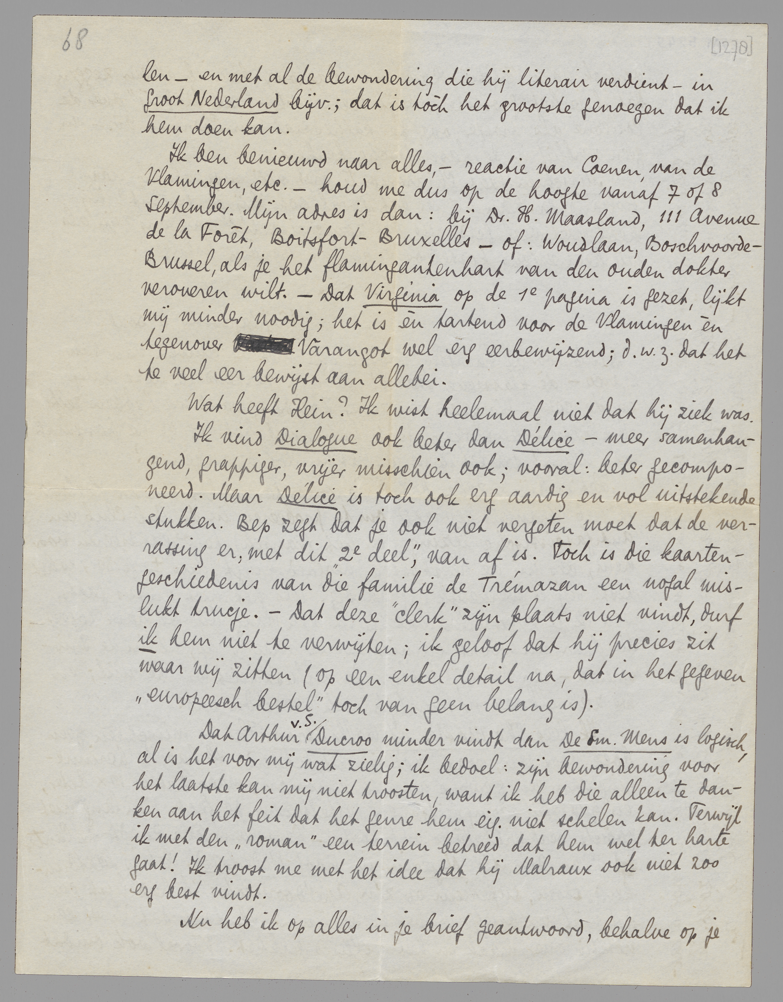 Ik ben benieuwd naar alles, - reactie van Coenen, van de Vlamingen, etc. - houd me dus op de hoogte vanaf 7 of 8 September. Mijn adres is dan: bij Dr. H. Maasland, iii Avenue de la Forêt, Boitsfort-Bruxelles - of Woudlaan, Boschvoorde-Brussel, als je het flamingantenhart van den ouden dokter veroveren wilt. - Dat Virginia op de 1e pagina is gezet, lijkt mij minder noodig; het is èn tartend voor de Vlamingen èn tegenover Varangot wel erg eerbewijzend; d.w.z. dat het teveel eer bewijst aan allebei.