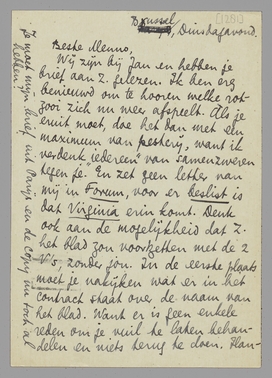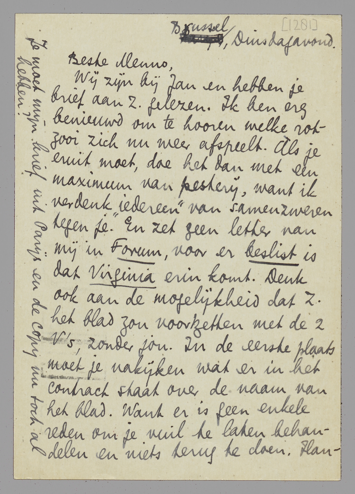 Wij zijn bij Jan en hebben je brief aan Z. gelezen. Ik ben erg benieuwd om te hooren welke rotzooi zich nu weer afspeelt. Als je eruit moet, doe het dan met een maximum van pesterij, want ik verdenk ‘iedereen’ van samenzweren tegen je. En zet geen letter van mij in Forum, voor er beslist is dat Virginia erin komt. Denk ook aan de mogelijkheid dat Z. het blad zou voortzetten met de 2 V's, zonder jou. In de eerste plaats moet je nakijken wat er in het contract staat over de naam van het blad. Want er is geen enkele reden om je vuil te laten behandelen en niets terug te doen. Handel dus niet overijld.