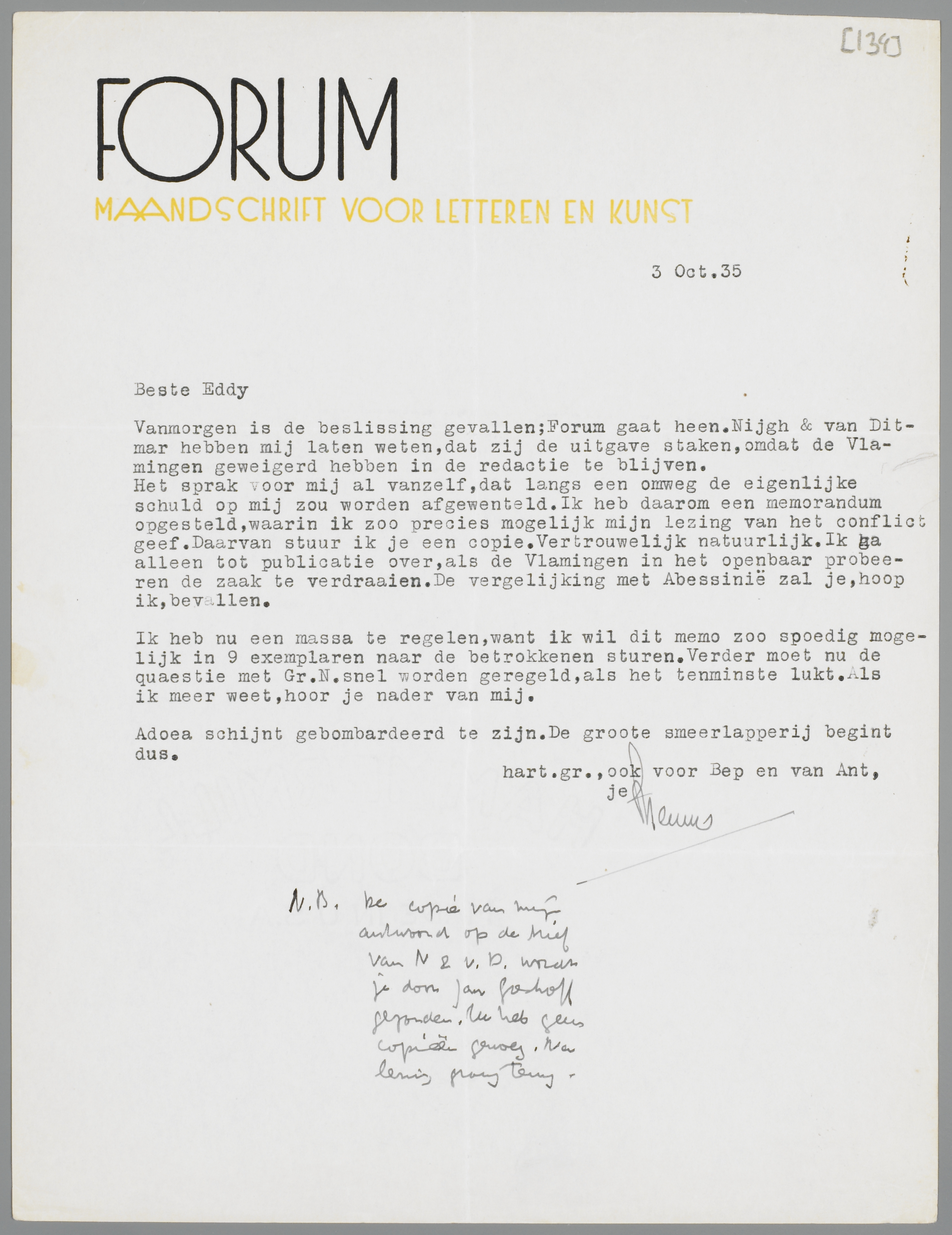 Vanmorgen is de beslissing gevallen; Forum gaat heen. Nijgh & van Ditmar hebben mij laten weten, dat zij de uitgave staken, omdat de Vlamingen geweigerd hebben in de redactie te blijven.