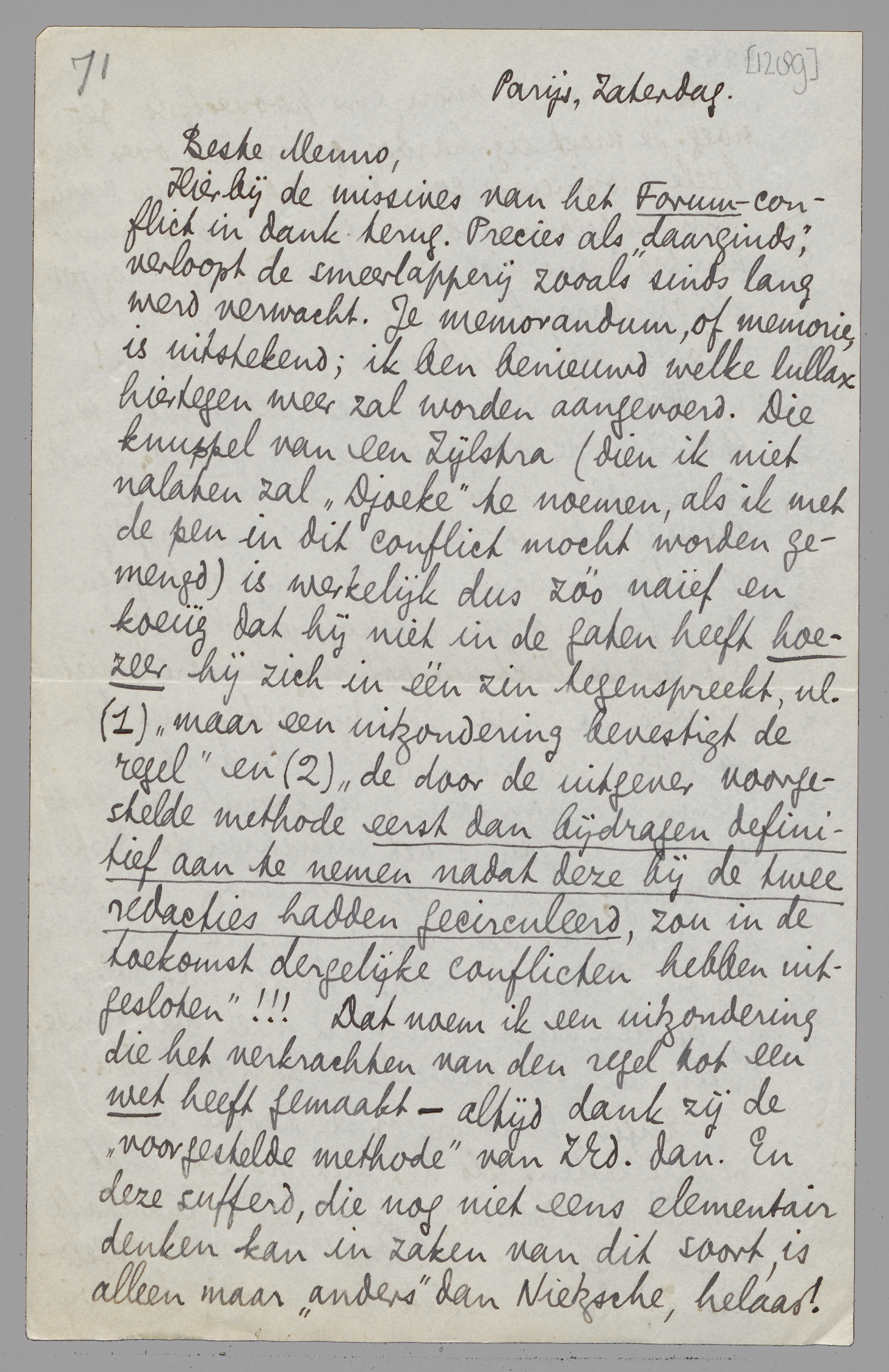 Hierbij de missives van het Forum-conflict in dank terug. Precies als ‘daarginds’, verloopt de smeerlapperij zooals sinds lang werd verwacht. Je memorandum, of memorie, is uitstekend; ik ben benieuwd welke lullax hiertegen weer zal worden aangevoerd. Die knuppel van een Zijlstra (dien ik niet nalaten zal ‘Djoeke’ te noemen, als ik met de pen in dit conflict mocht worden gemengd) is werkelijk dus zóó naïef en koeïg dat hij niet in de gaten heeft hoezeer hij zich in één zin tegenspreekt, nl. (1) ‘maar een uitzondering bevestigt de regel’ en (2) ‘de door de uitgever voorgestelde methode eerst dan bijdragen definitief aan te nemen nadat deze bij de twee redacties hadden gecirculeerd, zou in de toekomst dergelijke conflicten hebben uitgesloten’!!! Dat noem ik een uitzondering die het verkrachten van den regel tot een wet heeft gemaakt - altijd dank zij de ‘voorgestelde methode’ van ZEd. dan. En deze sufferd, die nog niet eens elementair denken kan in zaken van dit soort, is alleen maar ‘anders’ dan Nietzsche, helaas!
