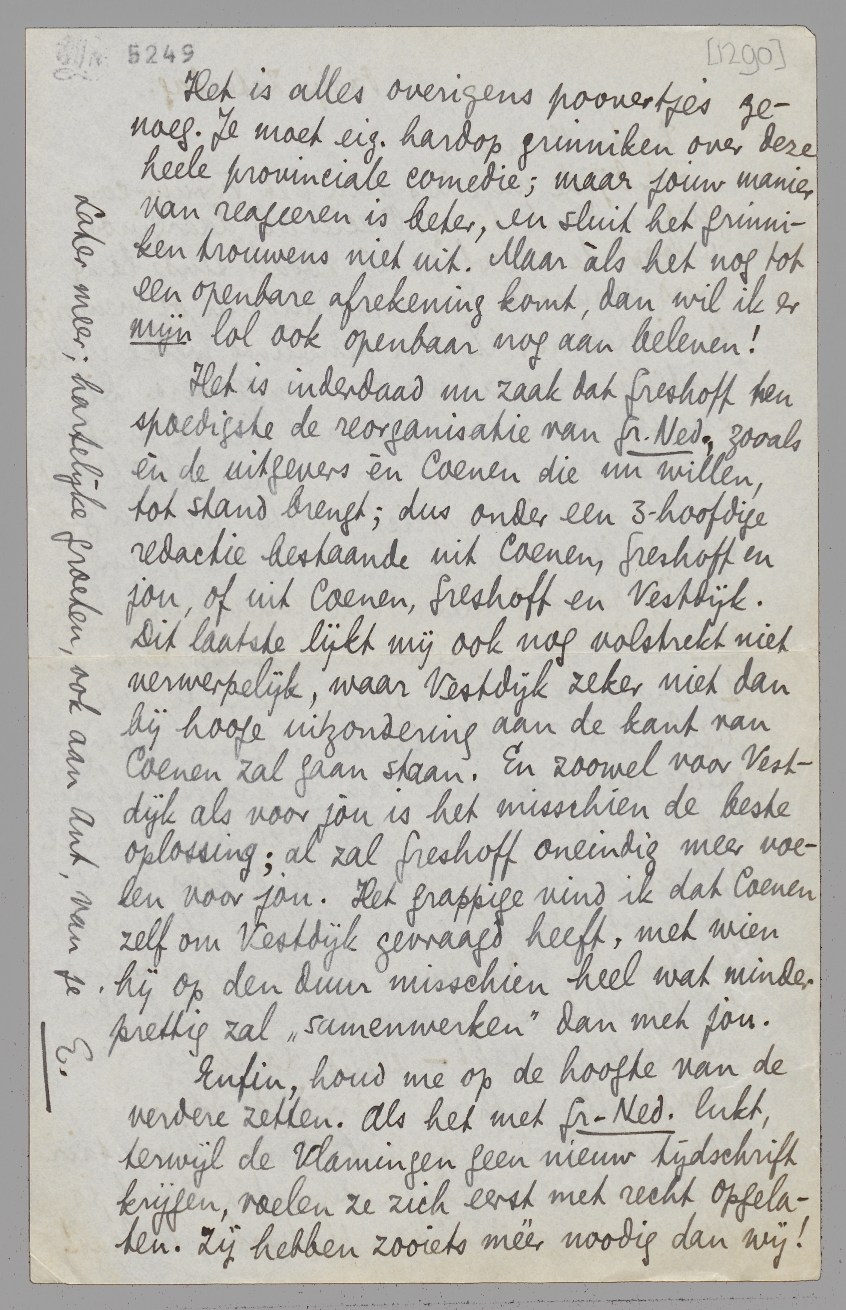 Het is inderdaad nu zaak dat Greshoff ten spoedigste de reorganisatie van Gr. Ned., zooals èn de uitgevers èn Coenen die nu willen, tot stand brengt; dus onder een 3-hoofdige redactie bestaande uit Coenen, Greshoff en jou, of uit Coenen, Greshoff en Vestdijk. Dit laatste lijkt mij ook nog volstrekt niet verwerpelijk, waar Vestdijk zeker niet dan bij hooge uitzondering aan de kant van Coenen zal gaan staan. En zoowel voor Vestdijk als voor jou is het misschien de beste oplossing; al zal Greshoff oneindig meer voelen voor jou. Het grappige vind ik dat Coenen zelf om Vestdijk gevraagd heeft, met wien hij op den duur misschien heel wat minder prettig zal ‘samenwerken’ dan met jou.
