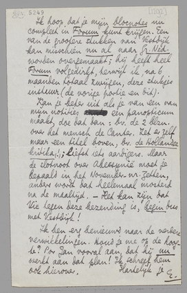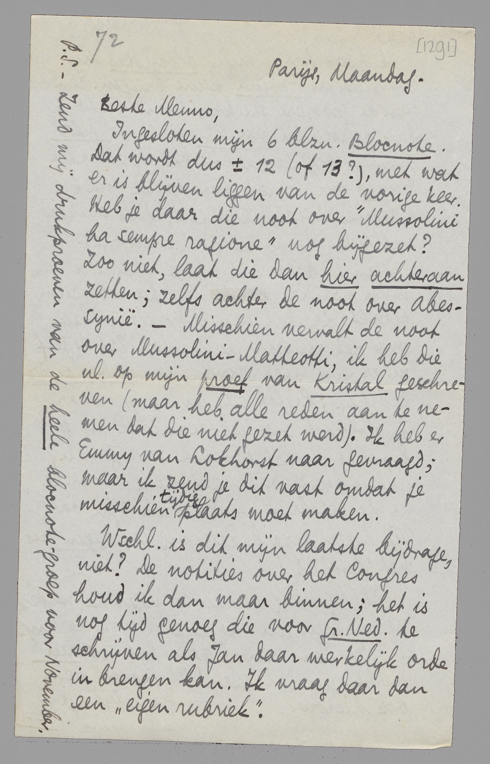 Ingesloten mijn 6 blzn. Blocnote. Dat wordt dus ± 12 (of 13?), met wat er is blijven liggen van de vorige keer. Heb je daar die noot over ‘Mussolini ha sempre ragione’ nog bijgezet? Zoo niet, laat die dan hier achteraan zetten; zelfs achter de noot over Abessynië. - Misschien vervalt de noot over Mussolini-Matteotti, ik heb die nl. op mijn proef van Kristal geschreven (maar heb alle reden aan te nemen dat die niet gezet werd). Ik heb er Emmy van Lokhorst naar gevraagd; maar ik zend je dit vast omdat je misschien tijdig plaats moet maken.