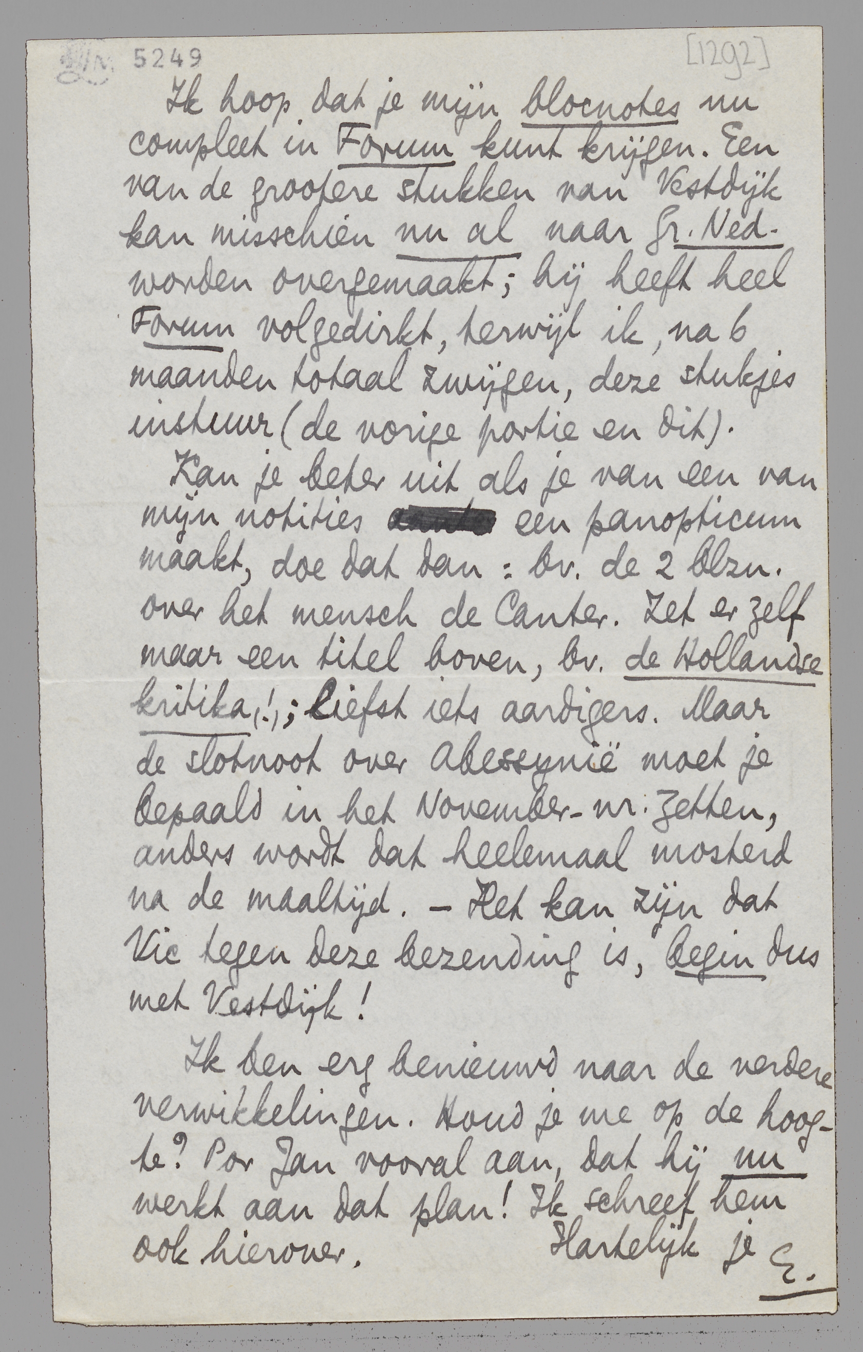 Ik hoop dat je mijn blocnotes nu compleet in Forum kunt krijgen. Een van de grootere stukken van Vestdijk kan misschien nu al naar Gr. Ned. worden overgemaakt; hij heeft heel Forum volgedirkt, terwijl ik, na 6 maanden totaal zwijgen, deze stukjes instuur (de vorige portie en dit).