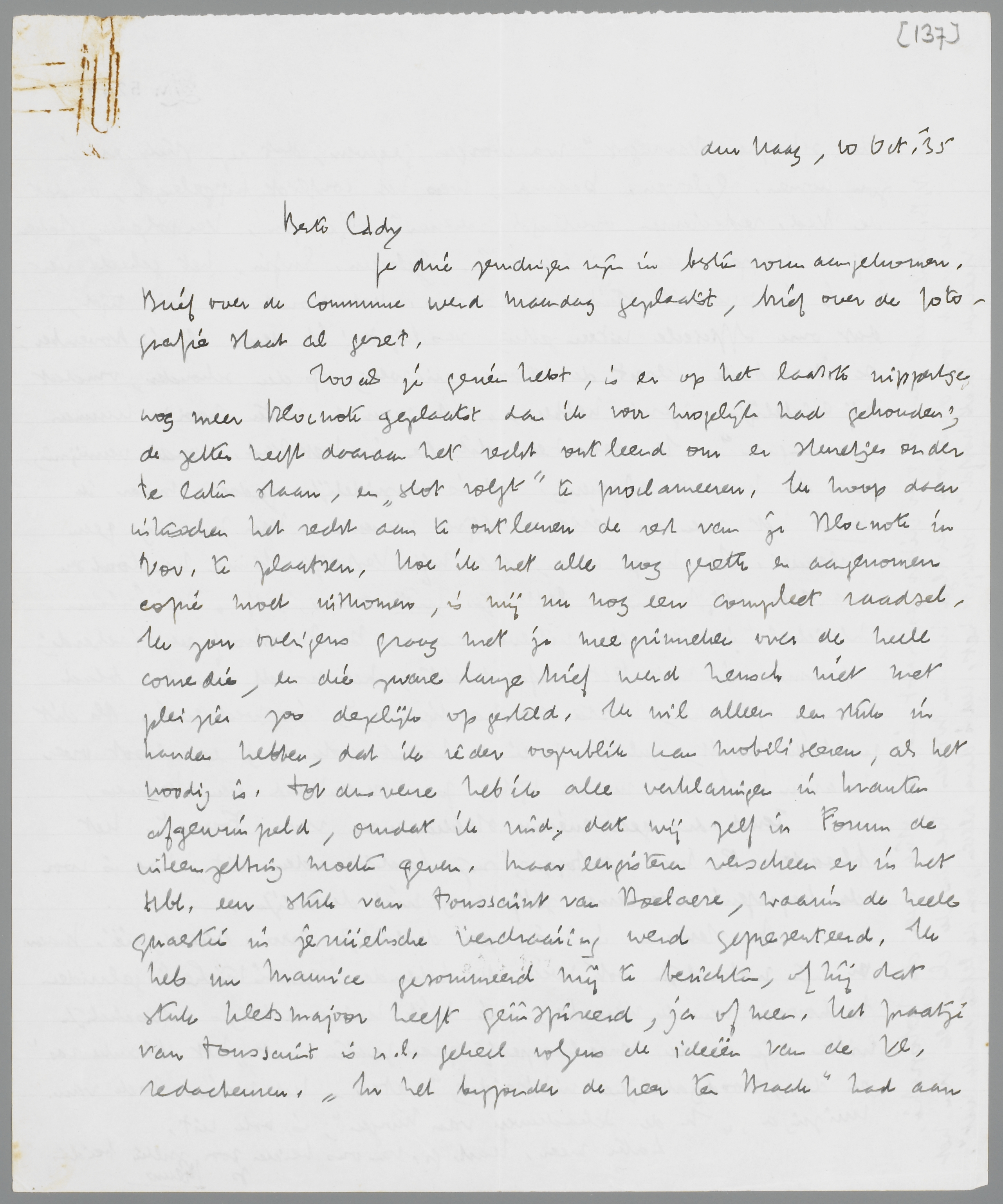 Zooals je gezien hebt, is er op het laatste nippertje nog meer Blocnote geplaatst dan ik voor mogelijk had gehouden; de zetter heeft daaraan het recht ontleend om er sterretjes onder te laten staan, en ‘slot volgt’ te proclameeren. Ik hoop daar intusschen het recht aan te ontleenen de rest van je Blocnote in Nov. te plaatsen. Hoe ik met alle nog gezette en aangenomen copie moet uitkomen, is mij nu nog een compleet raadsel. Ik zou overigens graag met je meegrinniken over de heele comedie, en die zware lange brief werd heusch niet met pleizier zoo degelijk opgesteld. Ik wil alleen een stuk in handen hebben, dat ik ieder oogenblik kan mobiliseeren, als het noodig is. Tot dusverre heb ik alle verklaringen in kranten afgewimpeld, omdat ik vind, dat wij zelf in Forum de uiteenzetting moeten geven. Maar eergisteren verscheen er in het Hbl. een stuk van Toussaint van Boelaere, waarin de heele quaestie in jezuïetische verdraaiing werd gepresenteerd. Ik heb nu Maurice gesommeerd mij te berichten, of hij dat stuk kletsmajoor heeft geïnspireerd, ja of neen. Het praatje van Toussaint is n.l. geheel volgens de ideeën van de Vl. redacteuren. ‘In het bijzonder de heer ter Braak’ had aan ‘den schrijver Varangot’ waarborgen gegeven, dat zijn stuk er in zou komen. Gelogen. Daarna ‘was het conflict bijgelegd, omdat de Ned. redacteuren overtuigd schenen’. Gelogen. Vervolgens ‘staken zij de koppen weer bij elkaar’. Gelogen. Enfin, het geheele verhaal is pus uit stinkende wonden. Het wordt dus hoog tijd, dat onze officieele uiteenzetting verschijnt; ik denk al in November. De Maasbode klopt de Vlamen uitvoerig op den schouder, omdat zij eindelijk ingezien hebben, ‘dat vuur en water nooit kunnen samengaan’. Ik dementeer dit alles in Het Vad., onder verwijzing naar de komende afrekening. Het is onzindelijk gedoe, maar ik moet het even au serieux blijven nemen. - Van Jan nog geen nieuws. Ik hoop maar, dat hij Vestdijk binnen kan loodsen, want er blijft anders letterlijk niets over. Zelfs Den Gulden Winckel is door den uitgever aan... De Bijenkorf versjacherd; Kramers is met Oct. afgedankt, het wordt nu een blad van ‘frissche, korte aankondigingen’, je weet wel. Als dit publiek wordt, zal ik er in de krant ook nog een noot over kraken! Ik heb nu de tijding pas onderhands van Kramers.