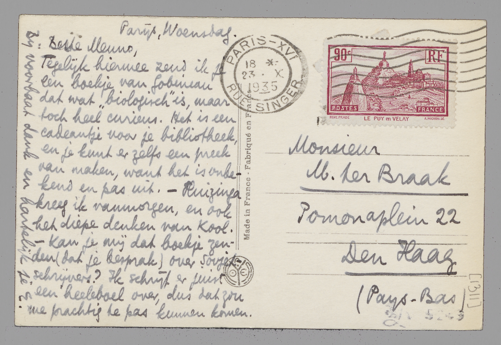 Tegelijk hiermee zend ik je een boekje van Gobineau dat wat ‘biologisch’ is, maar toch heel curieus. Het is een cadeautje voor je bibliotheek, en je kunt er zelfs een preek van maken, want het is onbekend en pas uit. - Huizinga kreeg ik vanmorgen, en ook het diepe denken van Kool. - Kan je mij dat boekje zenden (dat je besprak) over sovjet-schrijvers? Ik schrijf er juist een heeleboel over, dus dat zou me prachtig te pas kunnen komen.