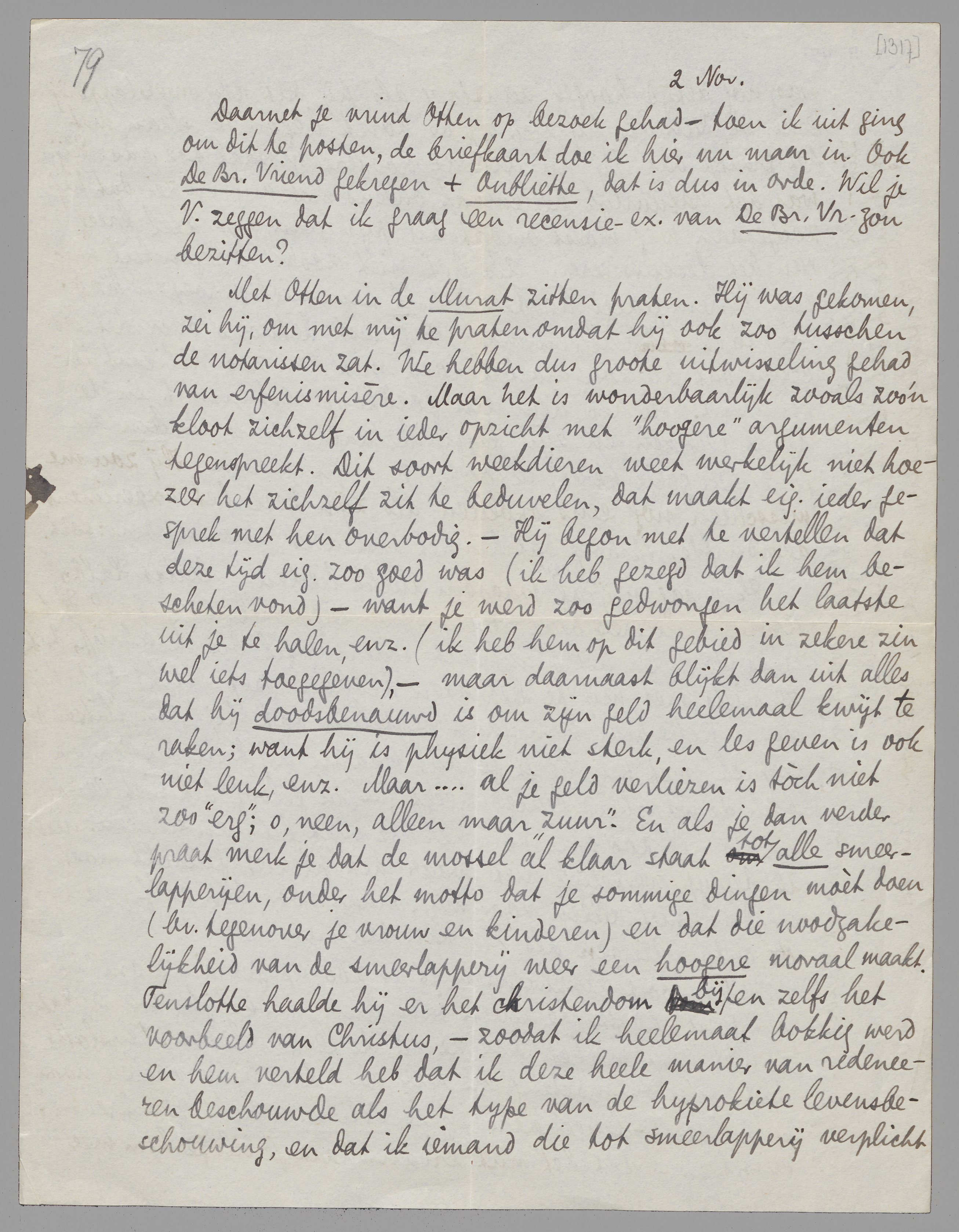 Met Otten in de Murat zitten praten. Hij was gekomen, zei hij, om met mij te praten omdat hij ook zoo tusschen de notarissen zat. We hebben dus groote uitwisseling gehad van erfenismisère. Maar het is wonderbaarlijk zooals zoo'n kloot zichzelf in ieder opzicht met ‘hoogere’ argumenten tegenspreekt. Dit soort weekdieren weet werkelijk niet hoezeer het zichzelf zit te beduvelen, dat maakt eig. ieder gesprek met hen overbodig. - Hij begon met te vertellen dat deze tijd eig. zoo goed was (ik heb gezegd dat ik hem bescheten vond) - want je werd zoo gedwongen het laatste uit je te halen, enz. (ik heb hem op dit gebied in zekere zin wel iets toegegeven), - maar daarnaast blijkt dan uit alles dat hij doodsbenauwd is om zijn geld heelemaal kwijt te raken; want hij is physiek niet sterk, en les geven is ook niet leuk, enz. Maar... al je geld verliezen is tòch niet zoo ‘erg’; o, neen, alleen maar ‘zuur’. En als je dan verder praat merk je dat de mossel al klaar staat tot alle smeerlapperijen, onder het motto dat je sommige dingen moèt doen (bv. tegenover je vrouw en kinderen) en dat die noodzakelijkheid van de smeerlapperij weer een hoogere moraal maakt.