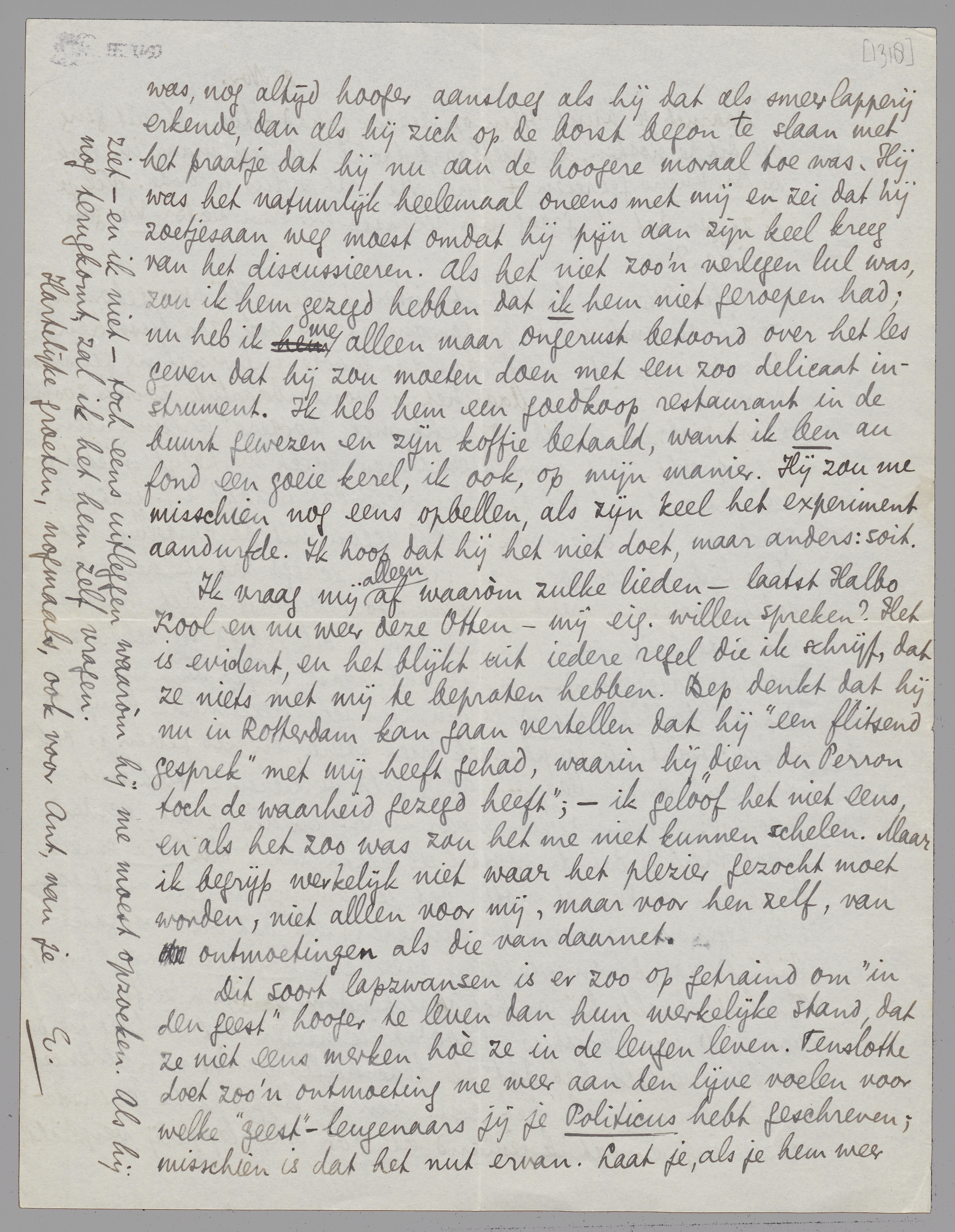 Dit soort lapzwansen is er zoo op getraind om ‘in den geest’ hooger te leven dan hun werkelijke stand, dat ze niet eens merken hoè ze in de leugen leven. Tenslotte doet zoo'n ontmoeting me weer aan den lijve voelen voor welke ‘geest’-leugenaars jij je Politicus hebt geschreven; misschien is dat het nut ervan. Laat je, als je hem weer ziet - en ik niet - toch eens uitleggen waaròm hij me moest opzoeken. Als hij nog terugkomt, zal ik het hem zelf vragen.