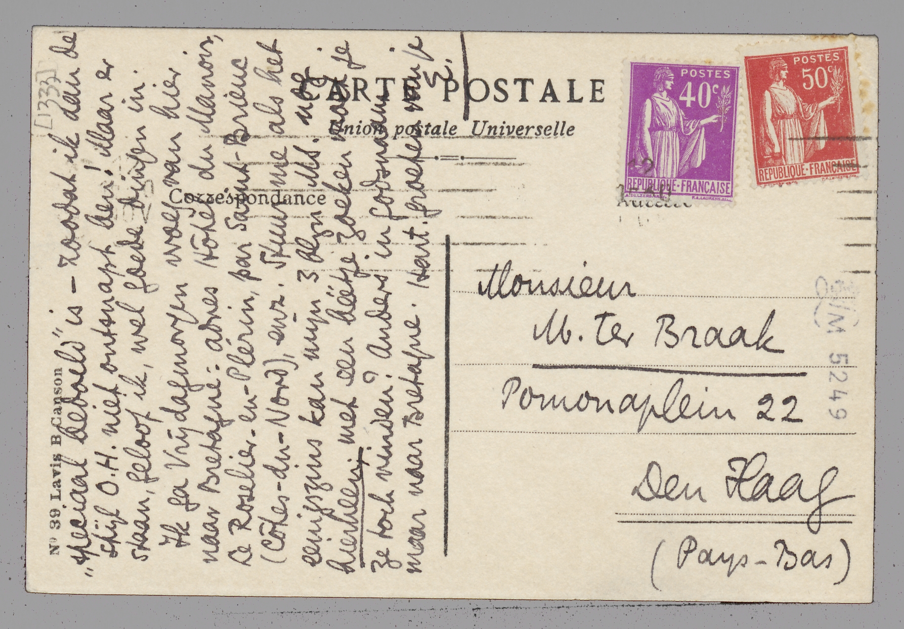 Het stuk over Vestdijk schreef ik en verzond ik vandaag. Een groot deel ervan is ongeïnspireerd geschreven, omdat ik 1o het eind van Else niet kende, 2o veel te weinig tijd had om het behoorlijk te doen, 3o mij zeer onaangenaam beïnvloed voelde door de lezers van Gr. Ned; voor wie dit stuk ‘speciaal bedoeld’ is - zoodat ik aan de stijl O.H. niet ontsnapt ben! Maar er staan, geloof ik, wel goede dingen in. Ik ga Vrijdagmorgen vroeg van hier naar Bretagne: adres Hôtel du Manoir, Le Roselier-en-Plérin, par Saint-Brieuc (Côtes-du-Nord), enz. Stuur me als het eenigszins kan mijn 3 blzn. MS. nog hierheen; met een béétje zoeken moet je ze toch vinden? Anders in godsnaam maar naar Bretagne.