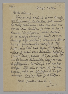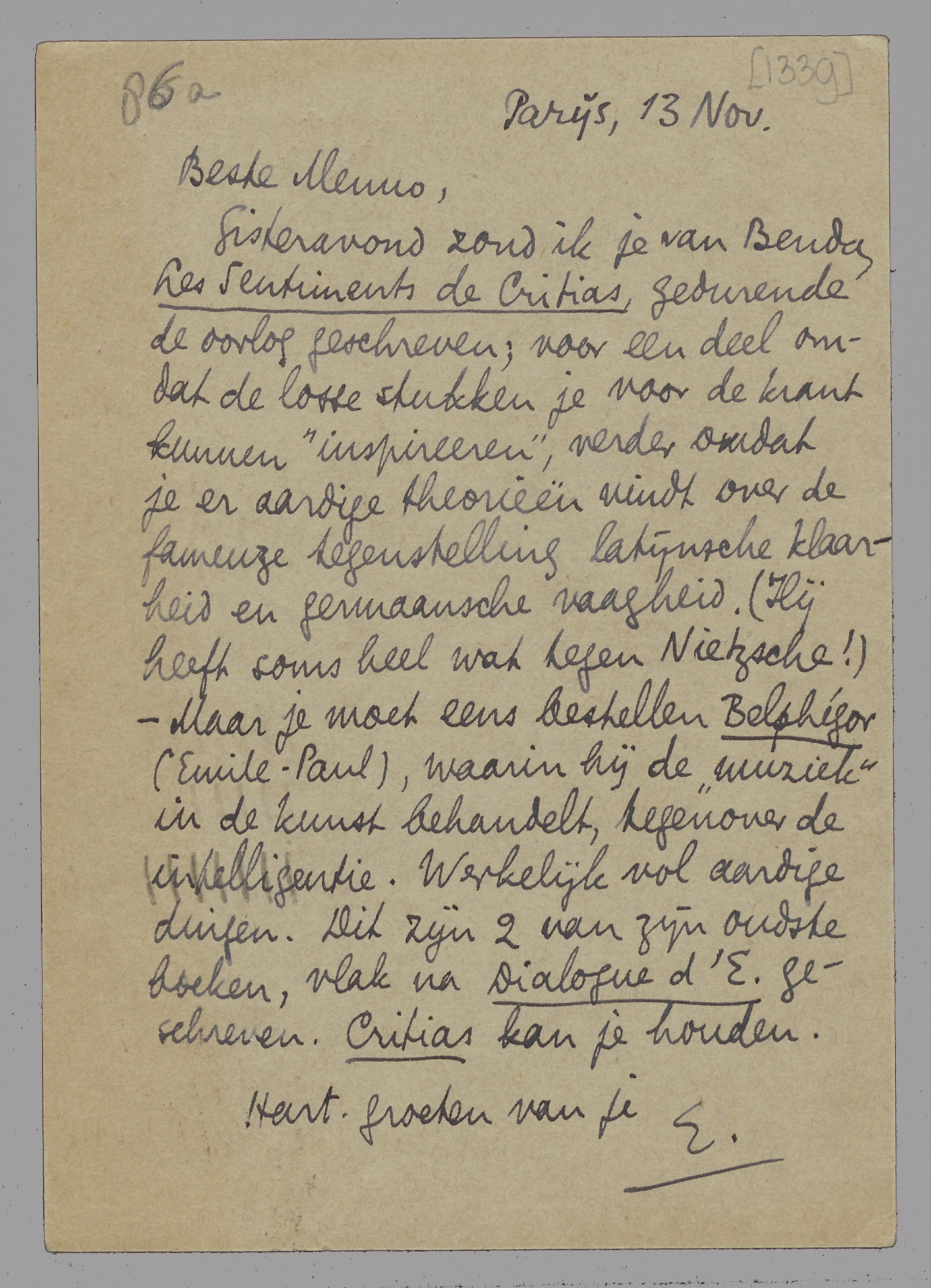 Gisteravond zond ik je van Benda Les Sentiments de Critias, gedurende de oorlog geschreven; voor een deel omdat de losse stukken je voor de krant kunnen ‘inspireeren’, verder omdat je er aardige theorieën vindt over de fameuze tegen- stelling latijnsche klaarheid en germaansche vaagheid. (Hij heeft soms heel wat tegen Nietzsche!) - Maar je moet eens bestellen Belphégor (Emile-Paul), waarin hij de ‘muziek’ in de kunst behandelt, tegenover de intelligentie. Werkelijk vol aardige dingen. Dit zijn 2 van zijn oudste boeken, vlak na Dialogue d'E. geschreven. Critias kan je houden.