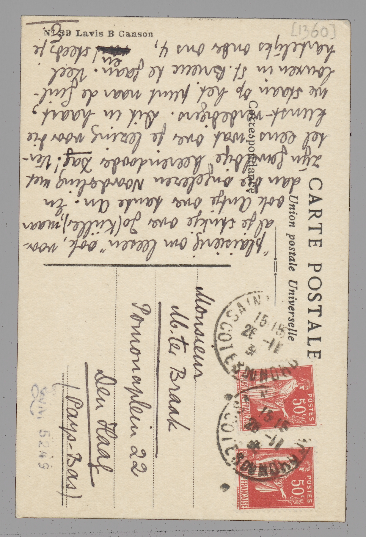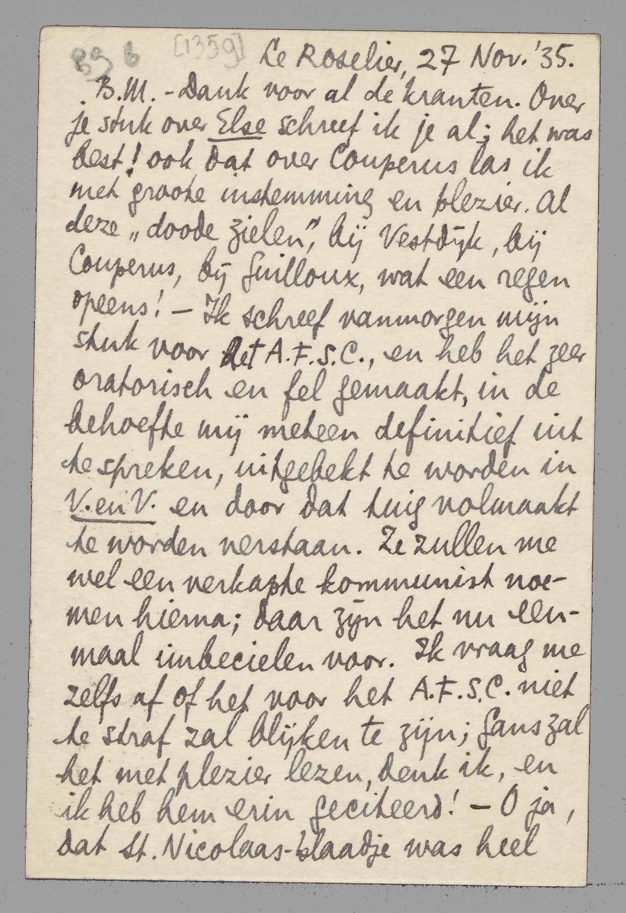 - Dank voor al de kranten. Over je stuk over Else schreef ik je al; het was best! ook dat over Couperus las ik met groote instemming en plezier. Al deze ‘doode zielen’, bij Vestdijk, bij Couperus, bij Guilloux, wat een regen opeens! - Ik schreef vanmorgen mijn stuk voor het A.F.S.C., en heb het zeer oratorisch en fel gemaakt, in de behoefte mij meteen definitief uit te spreken, uitgebekt te worden in V. en V. en door dat tuig volmaakt te worden verstaan. Ze zullen me wel een verkapte kommunist noemen hierna; daar zijn het nu eenmaal imbecielen voor. Ik vraag me zelfs af of het voor het A.F.S.C. niet te straf zal blijken te zijn; Gans zal het met plezier lezen, denk ik, en ik heb hem erin geciteerd! - O ja, dat St. Nicolaas-blaadje was heel ‘plaisierig om leesen’ ook, vooral je stukje over Jo (Küller), maar ook Antje over Tante An. En dan die ongelezen Noorderling met zijn geweldige beerendooder Dag! Vertel eens wat over je lezing voor die kunst-verdedigers. Dit in haast, we staan op het punt naar de Guillouxen in St. Brieuc te gaan. Veel hartelijks onder ons 4, en steeds je