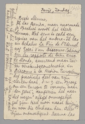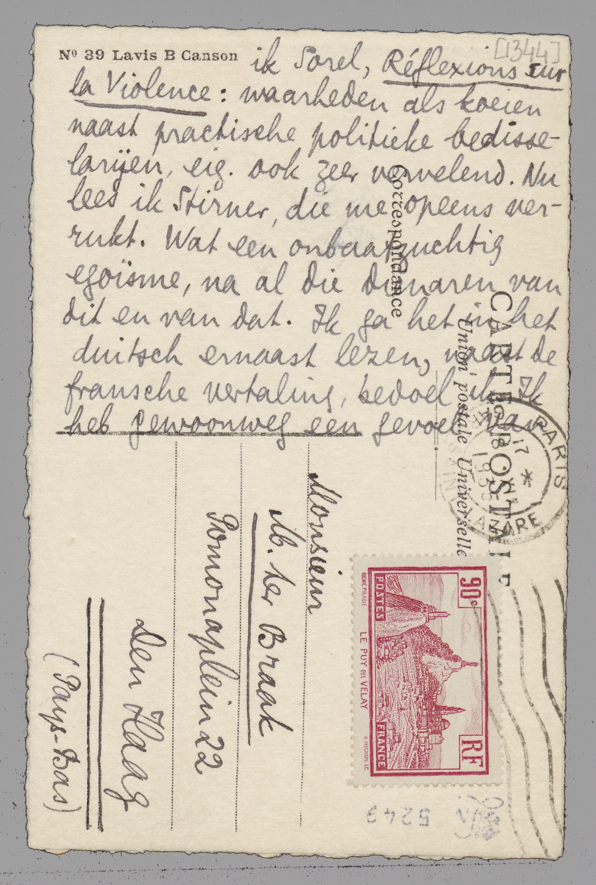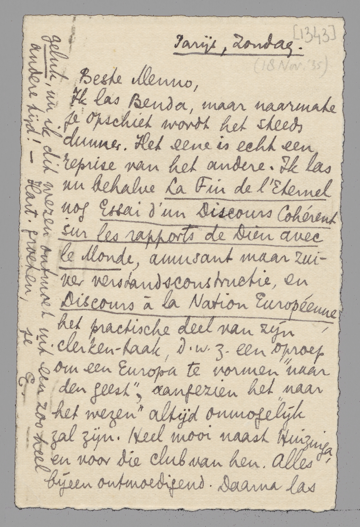 Ik las Benda, maar naarmate je opschiet wordt het steeds dunner. Het eene is echt een reprise van het andere. Ik las nu behalve La Fin de l'Eternel nog Essai d'un Discours Cohérent sur les rapports de Dieu avec le Monde, amusant maar zuiver verstandsconstructie, en Discours à la Nation Européenne, het practische deel van zijn clerkentaak, d.w.z. een oproep om een Europa te vormen ‘naar den geest’, aangezien het ‘naar het wezen’ altijd onmogelijk zal zijn. Heel mooi naast Huizinga, en voor die club van hen. Alles bijeen ontmoedigend. Daarna las ik Sorel, Réflexions sur la Violence: waarheden als koeien naast practische politieke bedisselarijen, eig. ook zeer vervelend. Nu lees ik Stirner, die me opeens verrukt. Wat een onbaatzuchtig egoïsme, na al die dienaren van dit en van dat. Ik ga het in het duitsch ernaast lezen, naast de fransche vertaling, bedoel ik. Ik heb gewoonweg een gevoel van geluk, nu ik dit wezen ontmoet uit een zoo heel andere tijd! -
