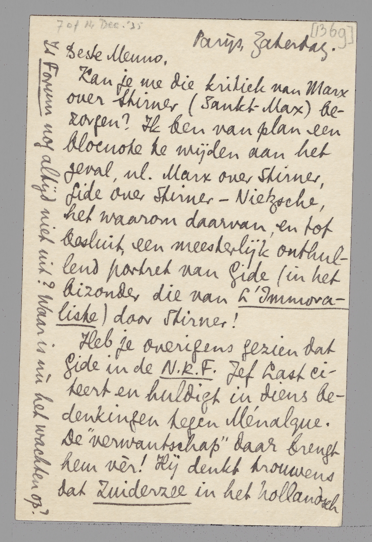 Kan je me die kritiek van Marx over Stirner (Sankt-Max) bezorgen? Ik ben van plan een blocnote te wijden aan het geval, nl. Marx over Stirner, Gide over Stirner-Nietzsche, het waarom daarvan, en tot besluit, een meesterlijk onthullend portret van Gide (in het bizonder die van L'Immoraliste) door Stirner!