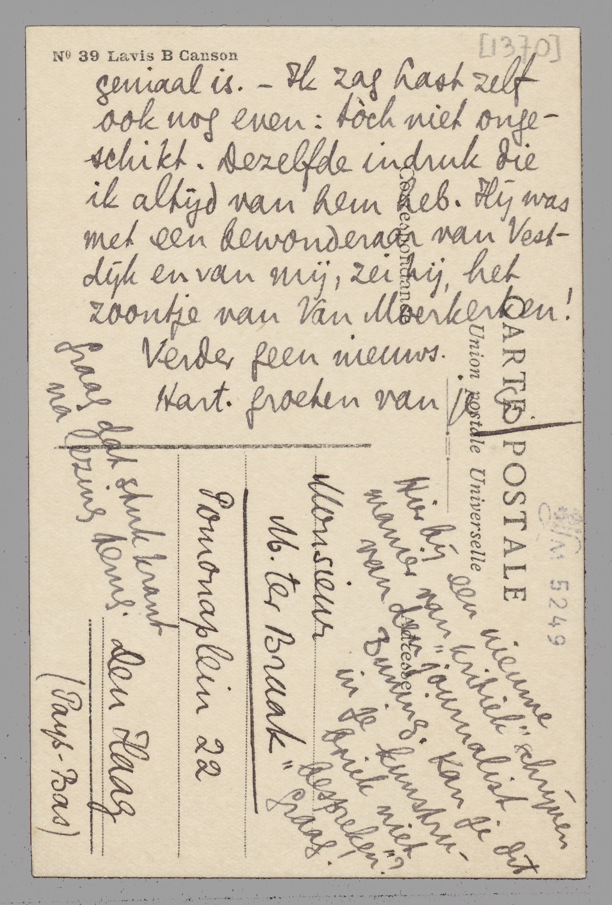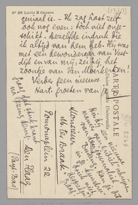 Heb je overigens gezien dat Gide in de N.R.F. Jef Last citeert en huldigt in diens bedenkingen tegen Ménalque. ‘De verwantschap’ daar brengt hem vèr! Hij denkt trouwens dat Zuiderzee in het hollandsch geniaal is. - Ik zag Last zelf ook nog even: tòch niet ongeschikt. Dezelfde indruk die ik altijd van hem heb. Hij was met een bewonderaar van Vestdijk en mij, zei hij, het zoontje van Van Moerkerken!