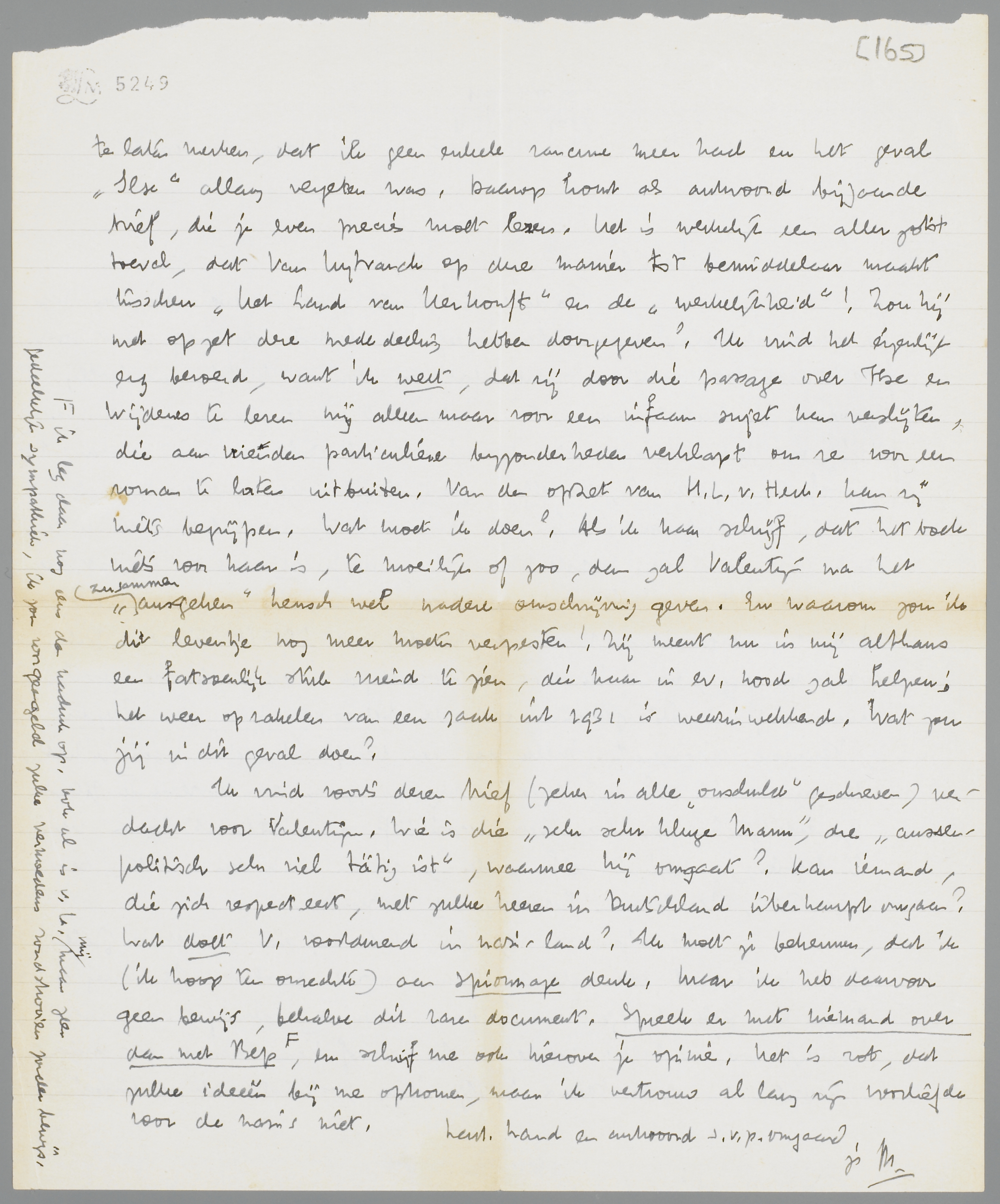 Ik vind voorts dezen brief (zeker in alle ‘onschuld’ geschreven) verdacht voor Valentijn. Wie is die ‘sehr sehr kluge Mann’, die ‘aussenpolitisch sehr viel tätig ist’, waarmee hij omgaat? Kan iemand, die zich respecteert, met zulke heeren in Duitschland überhaupt omgaan? Wat doet V. voortdurend in naziland? Ik moet je bekennen, dat ik (ik hoop ten onrechte) aan spionnage denk. Maar ik heb daarvoor geen bewijs, behalve dit rare document. Spreek er met niemand over dan met Bep, ik leg daar nog eens de nadruk op. Ook al is v.U. mij zeer gedeeltelijk sympathiek, ik zou voor geen geld zulke vermoedens rondstrooien zonder bewijs, en schrijf me ook hierover je opinie. Het is rot, dat zulke ideeën bij me opkomen, maar ik vertrouw al lang zijn voorliefde voor de nazi's niet.