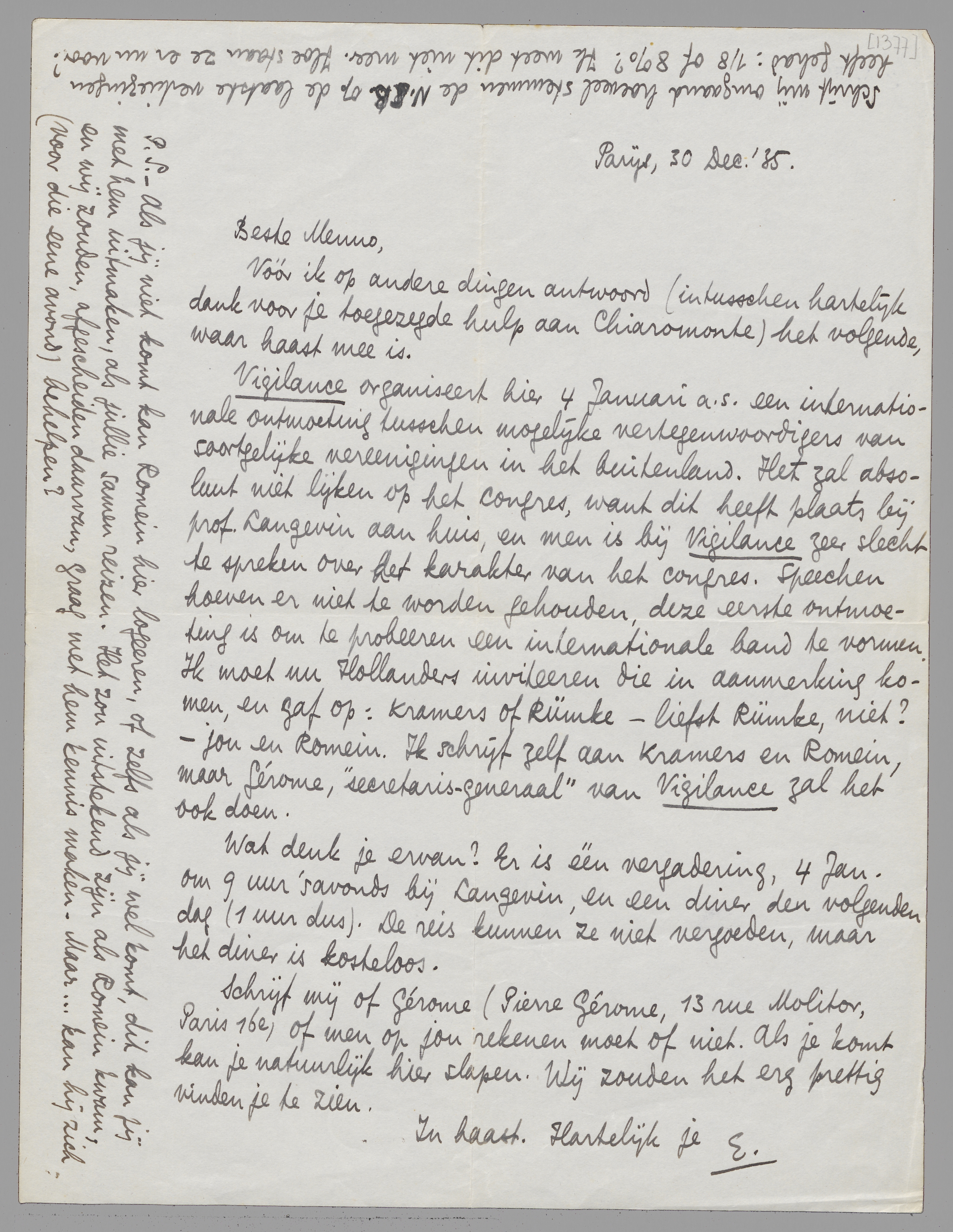 Vigilance organiseert hier 4 Januari a.s. een internationale ontmoeting tusschen mogelijke vertegenwoordigers van soortgelijke vereenigingen in het buitenland. Het zal absoluut niet lijken op het congres, want dit heeft plaats bij prof. Langevin aan huis, en men is bij Vigilance zeer slecht te spreken over het karakter van het congres. Speechen hoeven er niet te worden gehouden, deze eerste ontmoeting is om te probeeren een internationale band te vormen. Ik moet nu Hollanders inviteeren die in aanmerking komen, en gaf op: Kramers of Rümke - liefst Rümke, niet? - jou en Romein. Ik schrijf zelf aan Kramers en Romein, maar Gérome, ‘secretaris-generaal’ van Vigilance zal het ook doen.