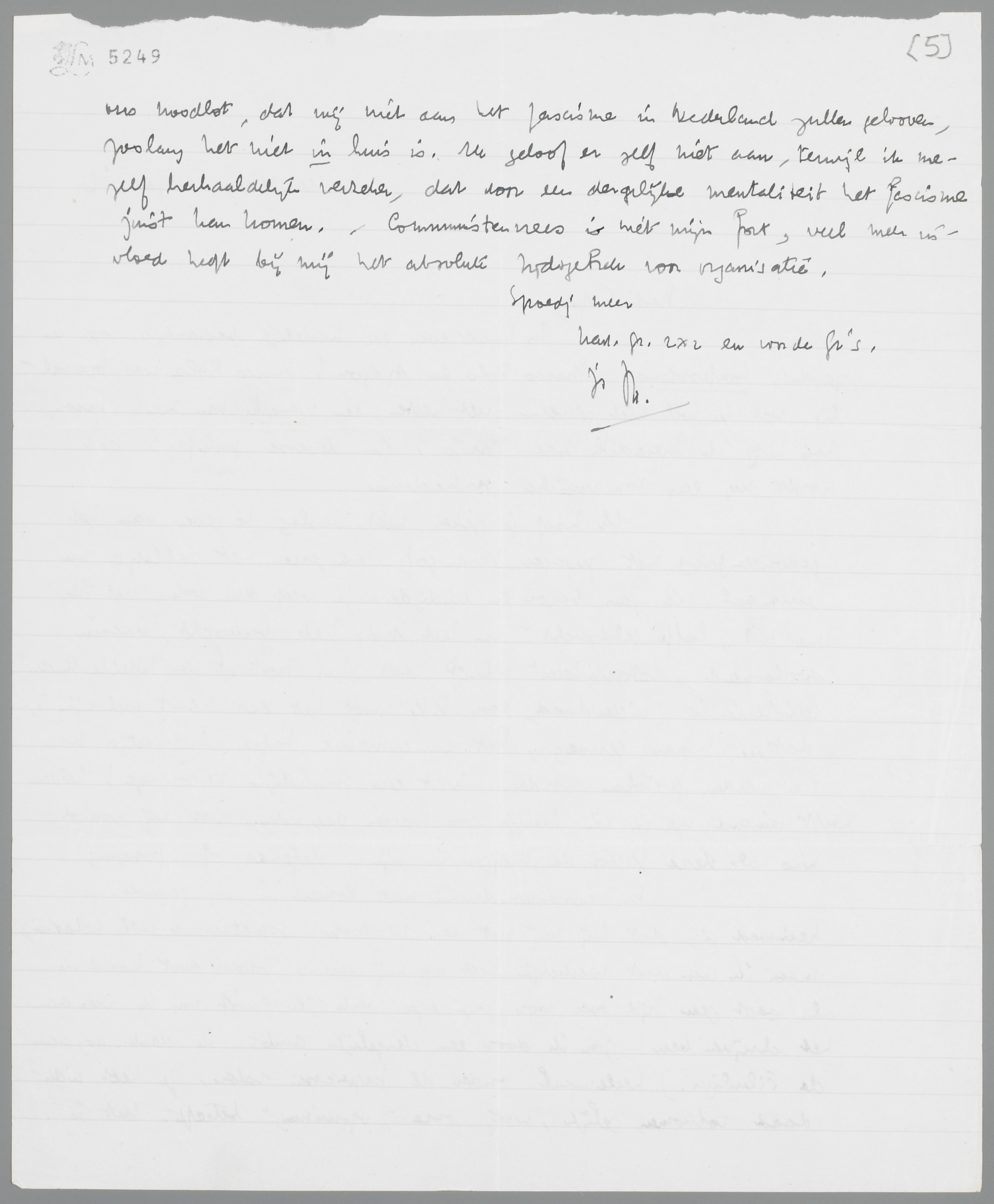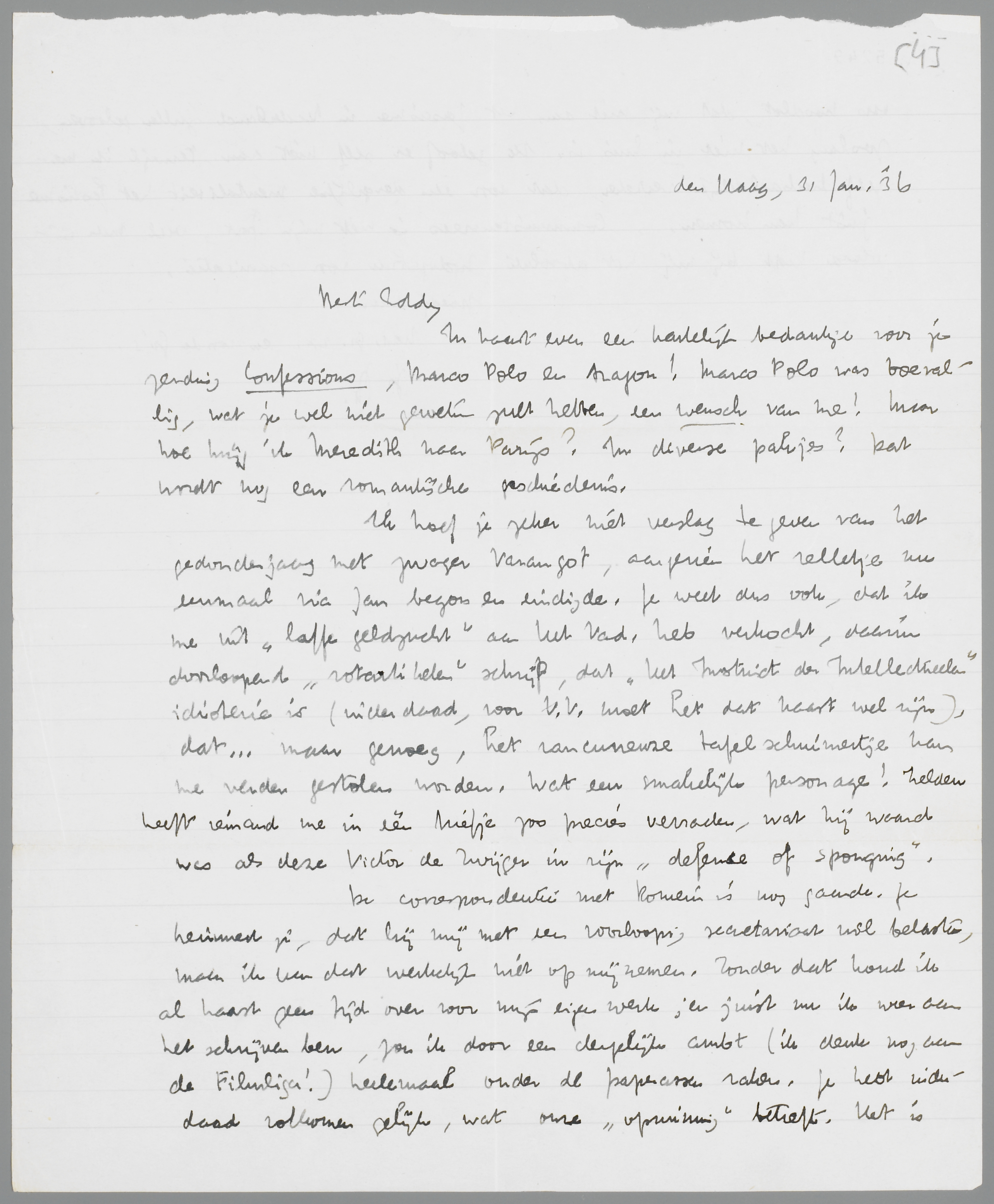 De correspondentie met Romein is nog gaande. Je herinnert je, dat hij mij met een voorloopig secretariaat wil belasten, maar ik kan dat werkelijk niet op mij nemen. Zonder dat houd ik al haast geen tijd over voor mijn eigen werk; en juist nu ik weer aan het schrijven ben, zou ik door een dergelijk ambt (ik denk nog aan de Filmliga!) heelemaal onder de paperassen raken. Je hebt inderdaad volkomen gelijk, wat onze ‘opruiming’ betreft. Het is ons noodlot, dat wij niet aan het fascisme in Nederland zullen gelooven, zoolang het niet in huis is. Ik geloof er zelf niet aan, terwijl ik mezelf herhaaldelijk verzeker, dat door een dergelijke mentaliteit het fascisme juist kan komen. Communistenvrees is niet mijn fort, veel meer invloed heeft bij mij het absolute tijdsgebrek voor organisatie.