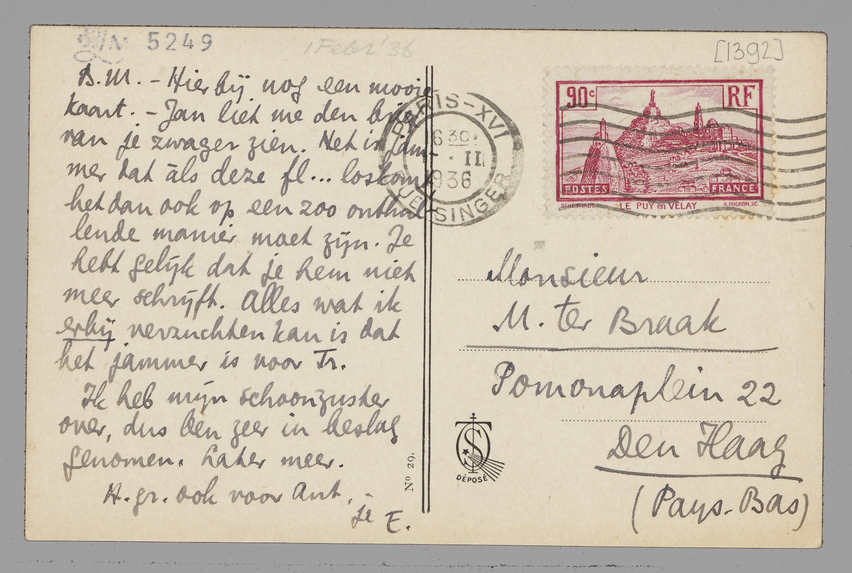 - Hierbij nog een mooie kaart. - Jan liet me den brief van je zwager zien. Het is jammer dat àls deze fl... loskomt het dan ook op een zoo onthullende manier moet zijn. Je hebt gelijk dat je hem niet meer schrijft. Alles wat ik erbij verzuchten kan is dat het jammer is voor Tr.