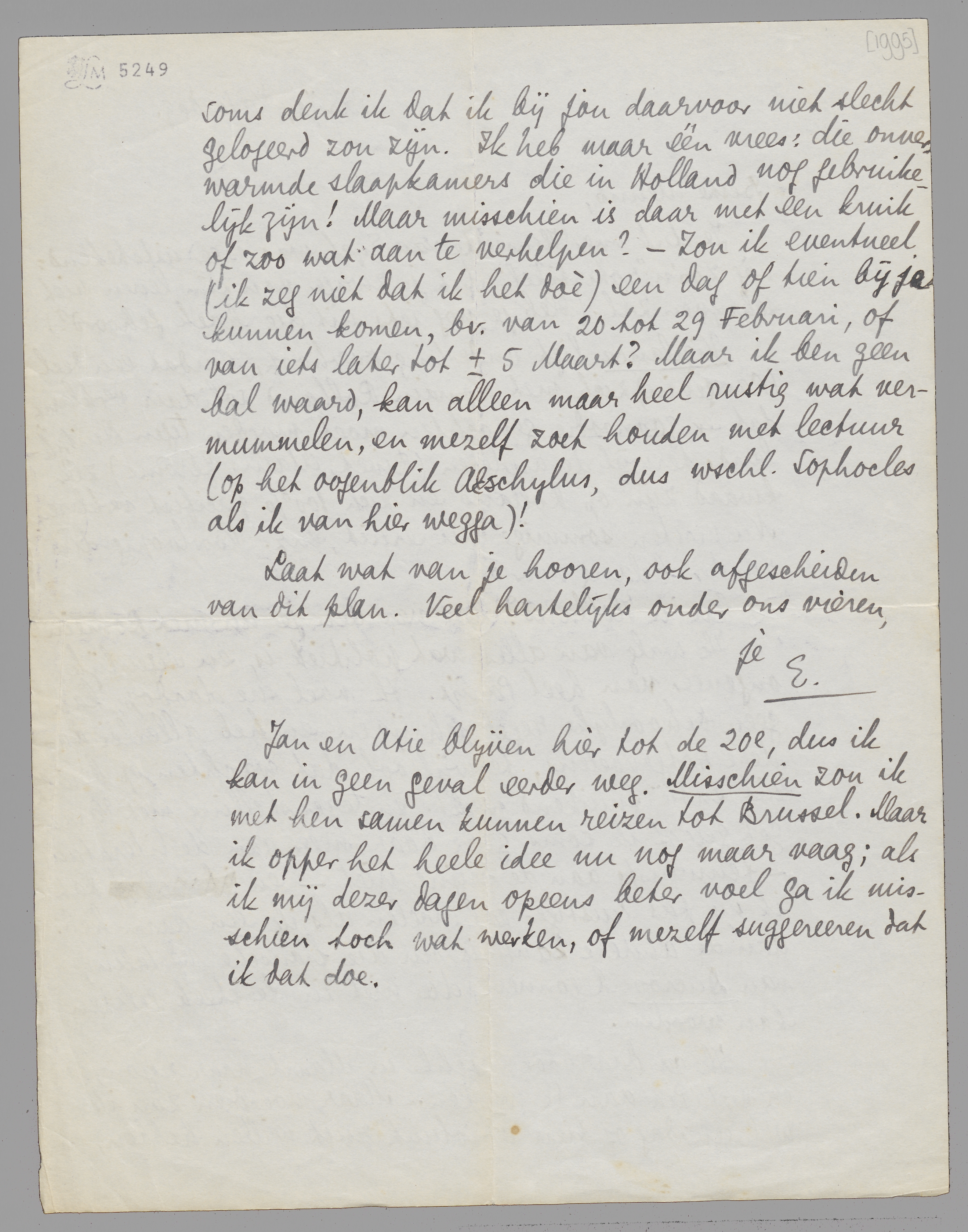 Ik ga daarvoor wschl. in Maart naar Lyon, om er met Pia aan te werken. Maar voordien zou ik wel een dag of tien absoluut rust willen hebben, en soms denk ik dat ik bij jou daarvoor niet slecht gelogeerd zou zijn. Ik heb maar één vrees: die onverwarmde slaapkamers die in Holland nog gebruikelijk zijn! Maar misschien is daar met een kruik of zoo wat aan te verhelpen? - Zou ik eventueel (ik zeg niet dat ik het doè) een dag of tien bij je kunnen komen, bv. van 20 tot 29 Februari, of van iets later tot ± 5 Maart? Maar ik ben geen bal waard, kan alleen maar heel rustig wat vermummelen, en mezelf zoet houden met lectuur (op het oogenblik Aeschylus, dus wschl. Sophocles als ik van hier wegga)!