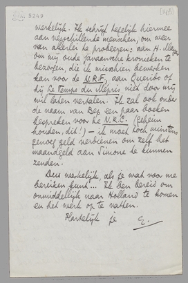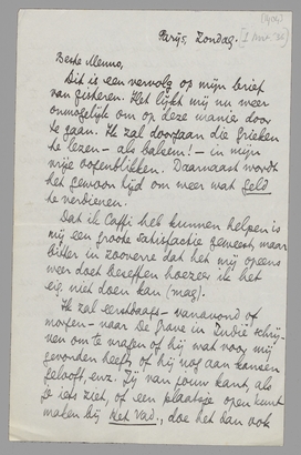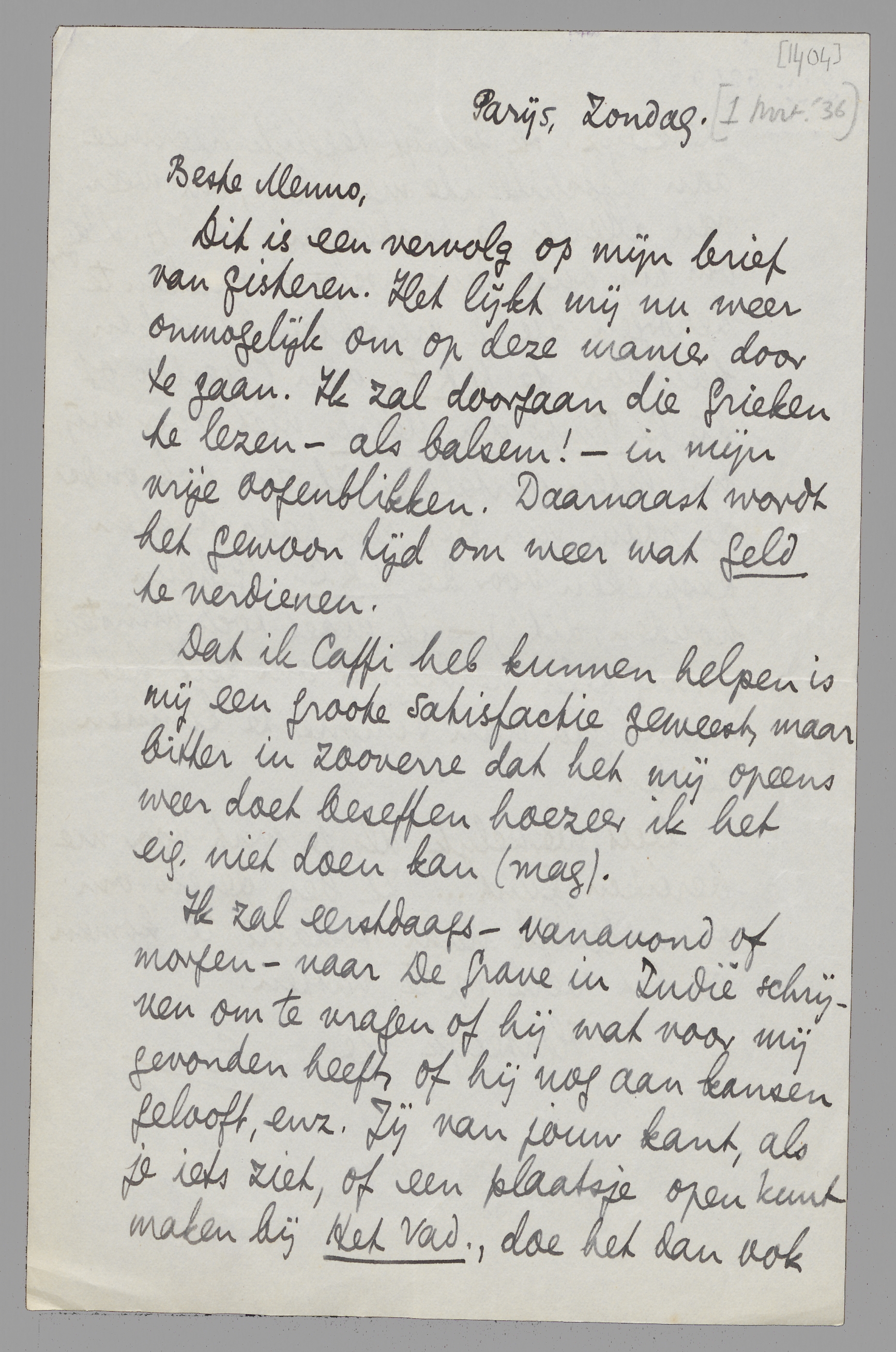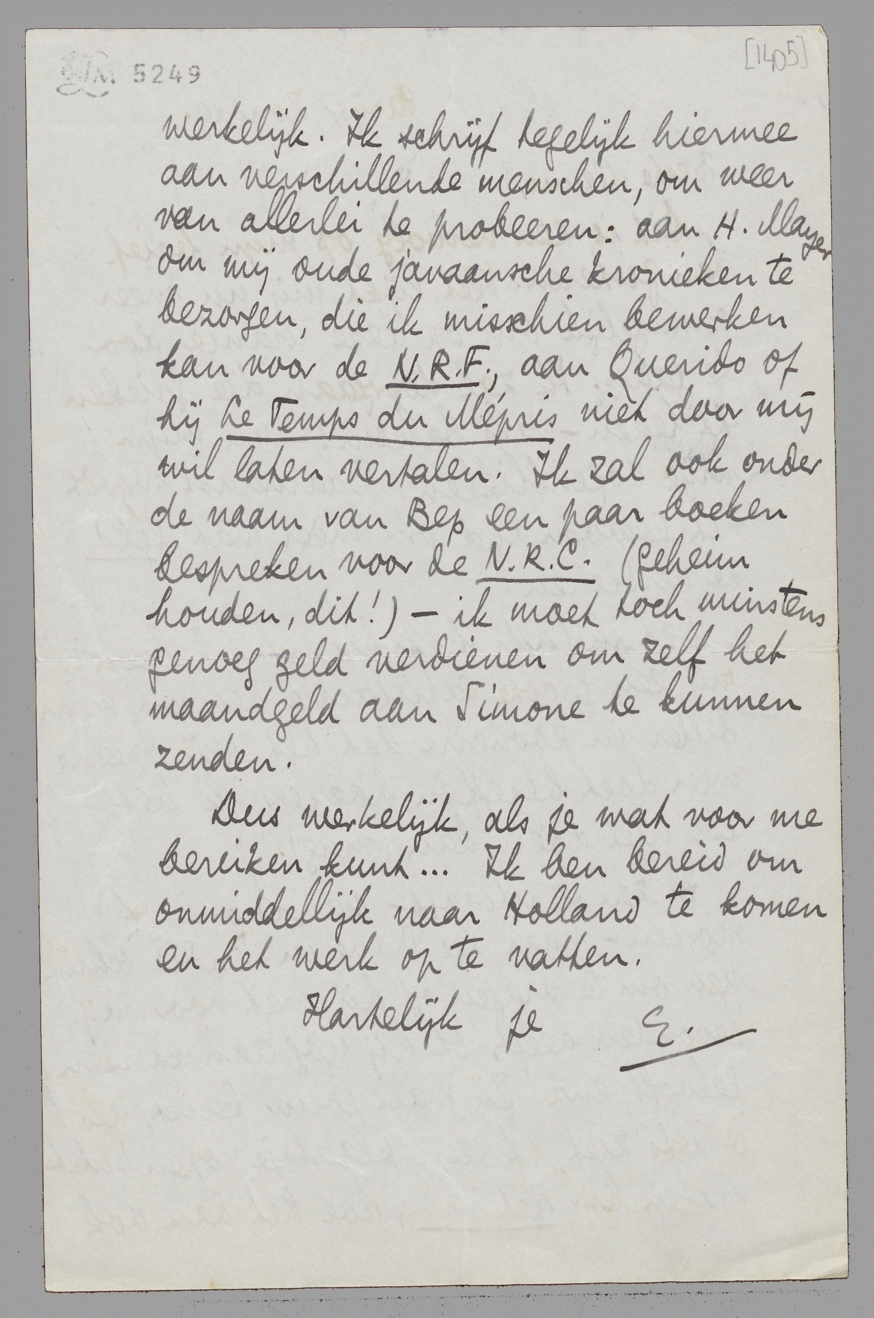 Ik zal eerstdaags - vanavond of morgen - naar De Grave in Indië schrijven om te vragen of hij wat voor mij gevonden heeft of hij nog aan kansen gelooft, enz. Jij van jouw kant, als je iets ziet, of een plaatsje open kunt maken bij Het Vad., doe het dan ook werkelijk. Ik schrijf tegelijk hiermee aan verschillende menschen om weer van allerlei te probeeren: aan H. Mayer om mij oude javaansche kronieken te bezorgen, die ik misschien bewerken kan voor de N.R.F., aan Querido of hij Le Temps du Mépris niet door mij wil laten vertalen. Ik zal ook onder de naam van Bep een paar boeken bespreken voor de N.R.C. (geheim houden, dit!) - ik moet toch minstens genoeg geld verdienen om zelf het maandgeld aan Simone te kunnen zenden.