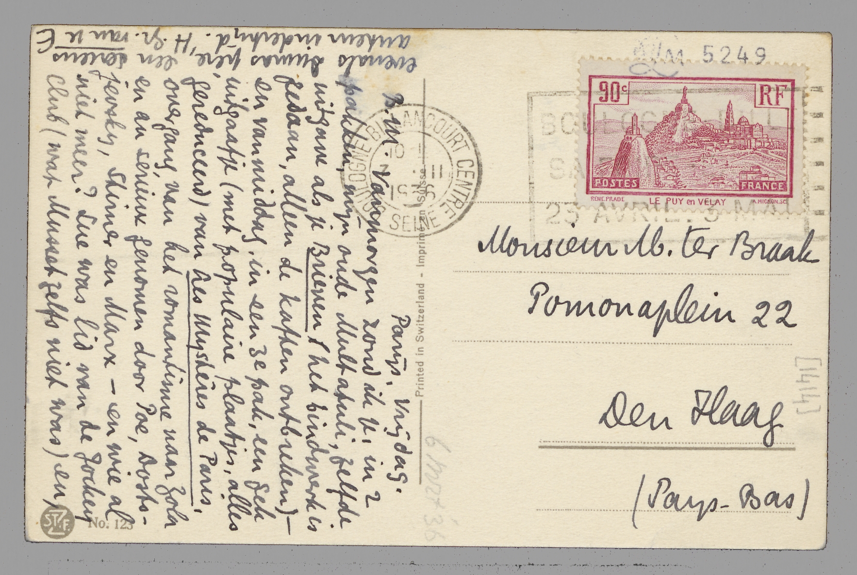 Vanmorgen zond ik je, in 2 pakken, mijn oude Multatuli, zelfde uitgave als je Brieven (het bindwerk is gedaan, alleen de kaften ontbreken) - en vanmiddag, in een 3e pak, een gek uitgaafje (met populaire plaatjes, alles gereduceerd) van Les Mystères de Paris, overgang van het romantisme naar Zola en au sérieux genomen door Poe, Dostojevsky, Stirner en Marx - en wie al niet meer? Sue was lid van de Jockey club (wat Musset zelfs niet was) en, evenals Dumas père, een serieus auteur indertijd.