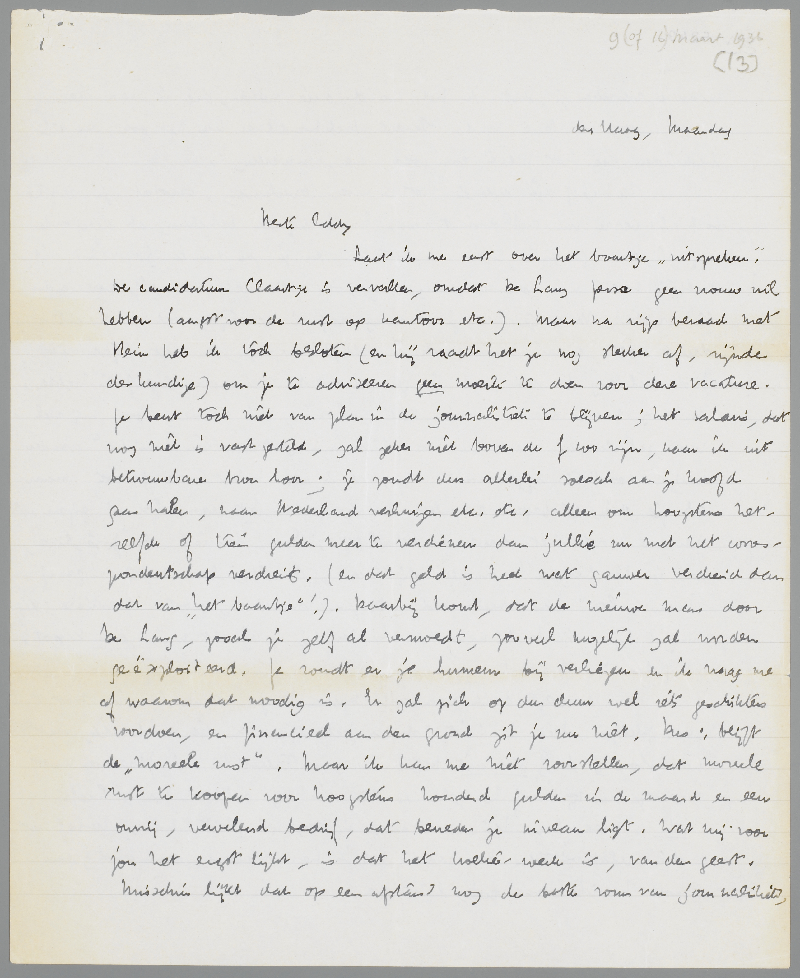 Laat ik me eerst over het baantje ‘uitspreken’. De candidatuur Claartje is vervallen, omdat De Lang perse geen vrouw wil hebben (angst voor de rust op kantoor etc.). Maar naar rijp beraad met Hein heb ik toch besloten (en hij raadt het je nog sterker af, zijnde deskundige) om je te adviseeren geen moeite te doen voor deze vacature. Je bent toch niet van plan in de journalistiek te blijven; het salaris, dat nog niet is vastgesteld, zal zeker niet boven de f 100 zijn, naar ik uit betrouwbare bron hoor; je zoudt dus allerlei soesah aan je hoofd gaan halen, naar Nederland verhuizen etc. etc. alleen om hoogstens hetzelfde of tien gulden meer te verdienen dan jullie nu met het correspondentschap verdient, (en dat geld is heel wat gauwer verdiend dan dat van ‘het baantje’!). Daarbij komt, dat de nieuwe man door De Lang, zooals je zelf al vermoedt, zooveel mogelijk zal worden geëxploiteerd. Je zoudt er je humeur bij verliezen en ik vraag me af waarom dat noodig is. Er zal zich op den duur wel iets geschikters voordoen, en financieel aan den grond zit je nu niet. Dus: blijft de ‘moreele rust’. Maar ik kan me niet voorstellen, dat moreele rust te koopen voor hoogstens honderd gulden in de maand en een onvrij, vervelend bedrijf, dat beneden je niveau ligt. Wat mij voor jou het ergst lijkt, is dat het koeliewerk is, van den geest. Misschien lijkt dat op een afstand nog de beste vorm van journalistiek, maar ik verzeker je, dat ik het na de drie weken, die ik voor Hein inval, verre van leuk vind. Iedere boekhandelaar kan het ook, en zijn bedienden doen het precies even goed, na ‘inwerking’.