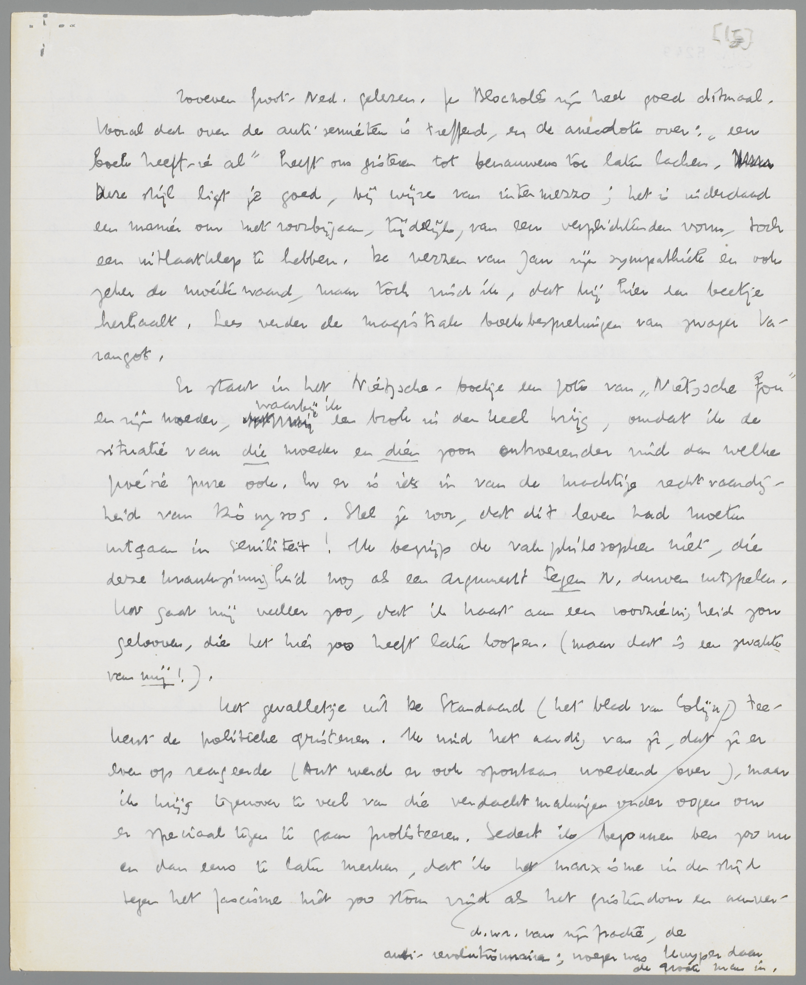 Er staat in het Nietzsche-boekje een foto van ‘Nietzsche fou’ en zijn moeder, waarbij ik een brok in den keel krijg, omdat ik de situatie van die moeder en dien zoon ontroerender vind dan welke poësie pure ook. En er is iets in van de machtige rechtvaardigheid van Dionysos. Stel je voor, dat dit leven had moeten uitgaan in seniliteit! Ik begrijp de vakphilosophen niet, die deze krankzinnigheid nog als een argument tegen N. durven uitspelen. Het gaat mij veeleer zoo, dat ik haast aan een voorzienigheid zou gelooven, die het hier zoo heeft laten loopen. (maar dat is een zwakte van mij!)