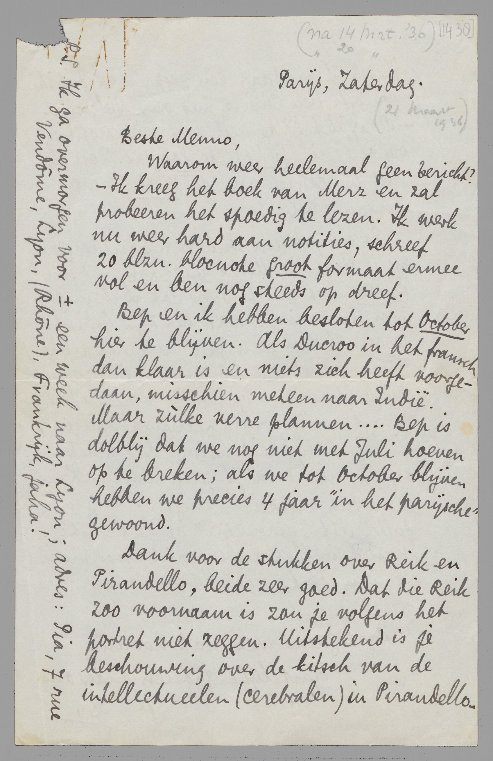 Bep en ik hebben besloten tot October hier te blijven. Als Ducroo in het fransch dan klaar is en niets zich heeft voorgedaan, misschien meteen naar Indië. Maar zùlke verre plannen... Bep is dolblij dat we nog niet met Juli hoeven op te breken; als we tot October blijven hebben we precies 4 jaar ‘in het parijsche’ gewoond.