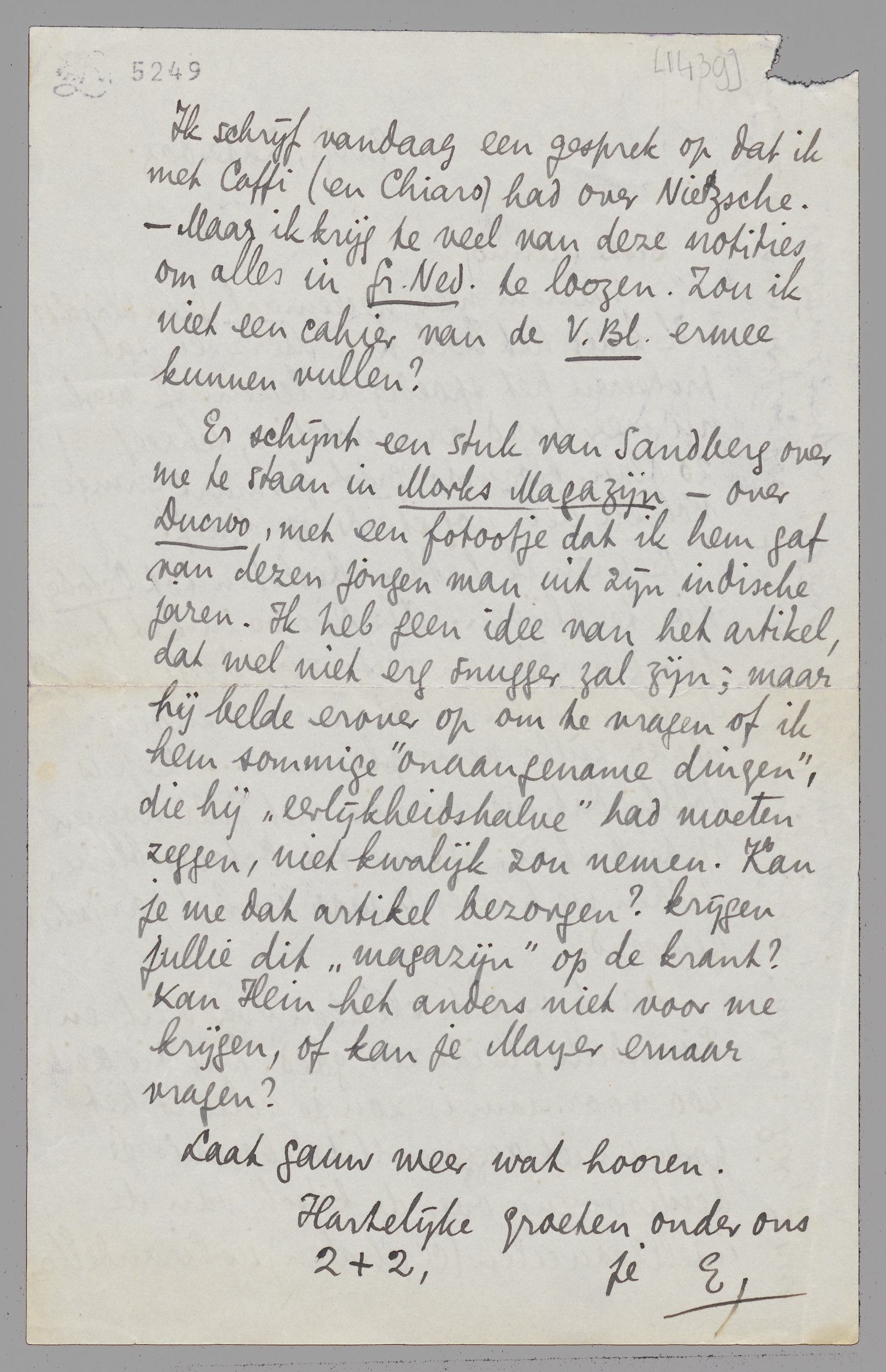 Er schijnt een stuk van Sandberg over me te staan in Morks Magazijn - over Ducroo, met een fotootje dat ik hem gaf van dezen jongen man uit zijn indische jaren. Ik heb geen idee van het artikel, dat wel niet erg snugger zal zijn; maar hij belde erover op om te vragen of ik hem sommige ‘onaangename dingen’, die hij ‘eerlijkheidshalve’ had moeten zeggen, niet kwalijk zou nemen. Kan je me dat artikel bezorgen? krijgen jullie dit ‘magazijn’ op de krant? Kan Hein het anders niet voor me krijgen, of kan Mayer ernaar vragen?