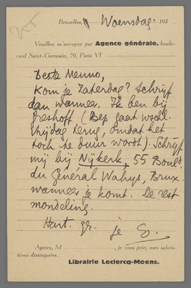 Kom je zaterdag? Schrijf dan wanneer. Ik ben bij Greshoff (Bep gaat wschl. vrijdag terug, omdat het toch te duur wordt). Schrijf mij bij Nijkerk, 55 Bould. du Général Wahys, Brux. wanneer je komt. De rest mondeling.