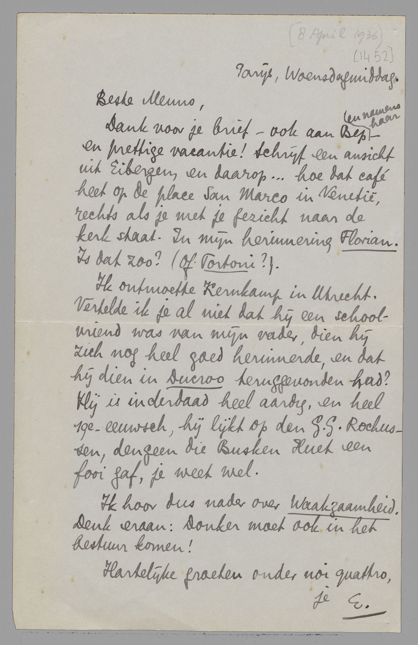 Dank voor je brief - ook aan Bep en namens haar - en prettige vacantie! Schrijf een ansicht uit Eibergen en daarop... hoe dat café heet op de place San Marco in Venetië, rechts als je met je gezicht naar de kerk staat. In mijn herinnering Florian. Is dat zoo? (Of Tortoni?).
