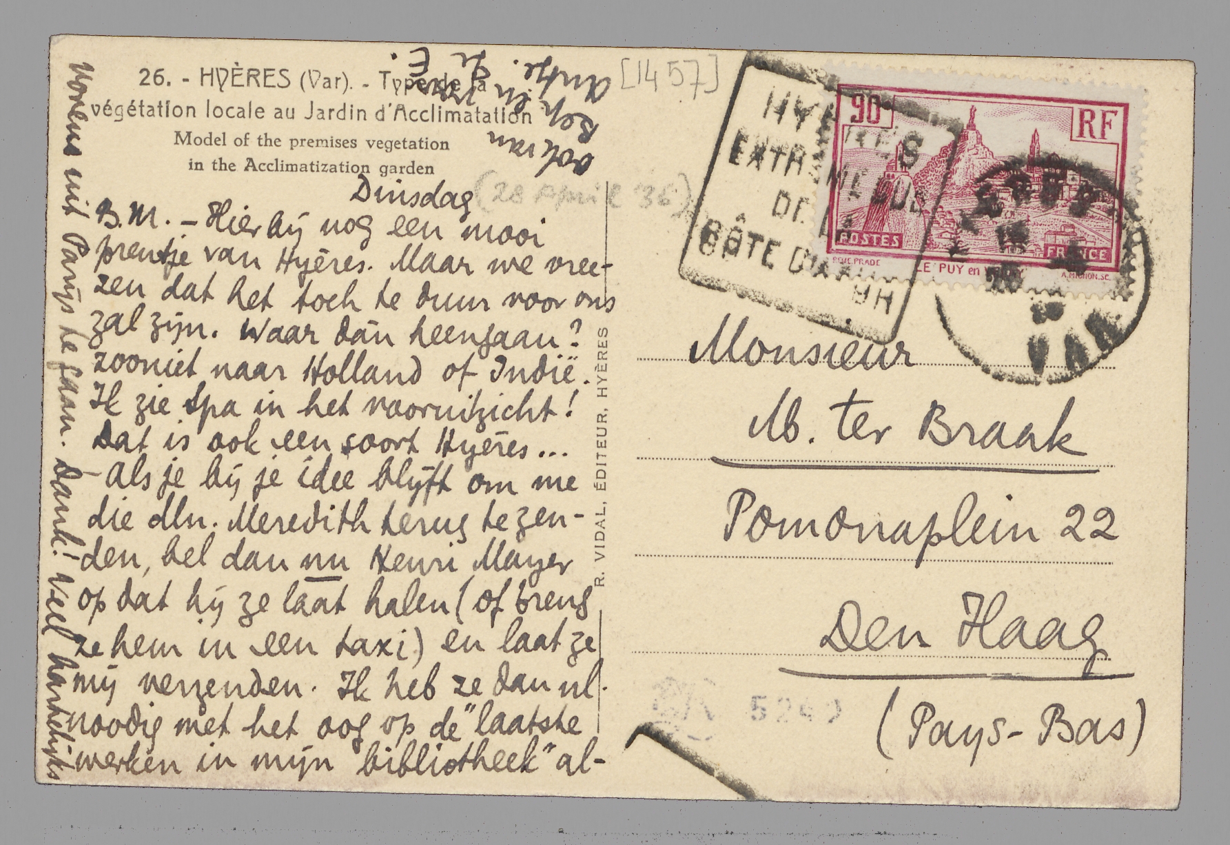 Hierbij nog een mooi prentje van Hyères. Maar we vreezen dat het toch te duur voor ons zal zijn. Waar dàn heengaan? zooniet naar Holland of Indië. Ik zie Spa in het vooruitzicht! Dat is ook een soort Hyères... Als je bij je idee blijft om me die dln. Meredith terug te zenden, bel dan nu Henri Mayer op dat hij ze laat halen (of breng ze hem in een taxi) en laat ze mij verzenden. Ik heb ze dan nl. noodig met het oog op de ‘laatste werken in mijn bibliotheek’ alvorens uit Parijs te gaan. Dank! Veel hartelijks ook van Bep en voor Antje.