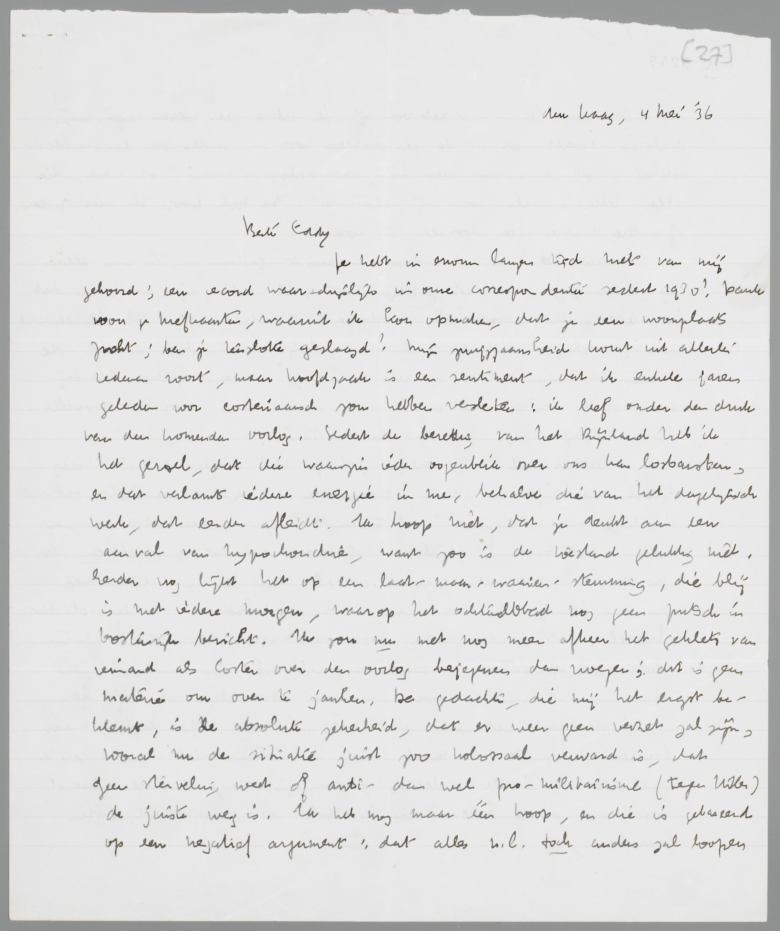Je hebt in enorm langen tijd niets van mij gehoord; een record waarschijnlijk in onze correspondentie sedert 1930! Dank voor je briefkaarten, waaruit ik kon opmaken, dat je een woonplaats zocht; ben je tenslotte geslaagd? Mijn zwijgzaamheid komt uit allerlei redenen voort, maar hoofdzaak is een sentiment, dat ik enkele jaren geleden voor costeriaansch zou hebben versleten: ik leef onder den druk van den komenden oorlog. Sedert de bezetting van het Rijnland heb ik het gevoel, dat die waanzin ieder oogenblik over ons kan losbarsten, en dat verlamt iedere energie in me, behalve die van het dagelijksch werk, dat eerder afleidt. Ik hoop niet, dat je denkt aan een aanval van hypochondrie, want zoo is de toestand gelukkig niet. Eerder nog lijkt het op een laat-maar-waaien-stemming, die blij is met iedere morgen, waarop het ochtendblad nog geen putsch in Oostenrijk bericht. Ik zou nu met nog meer afkeer het geklets van iemand als Coster over den oorlog bejegenen dan vroeger; dit is geen materie om over te janken. De gedachte, die mij het ergst beklemt, is de absolute zekerheid, dat er weer geen verzet zal zijn, vooral nu de situatie juist zoo kolossaal verward is, dat geen sterveling weet of anti- dan wel pro-militairisme (tegen Hitler) de juiste weg is. Ik heb nog maar één hoop, en die is gebaseerd op een negatief argument: dat alles n.l. toch anders zal loopen dan wij verwachten. Hoe het ook zij, ik heb in geen weken aan mijn dialogen gewerkt; als ik de pen opneem voor iets anders dan een dagblad-artikel, voel ik ineens weer die ‘voor-oorlogs-stemming’ op komen, die alles, letterlijk alles voor mij relativeert. En toch hoop ik hier op een of andere manier weer doorheen te komen.