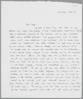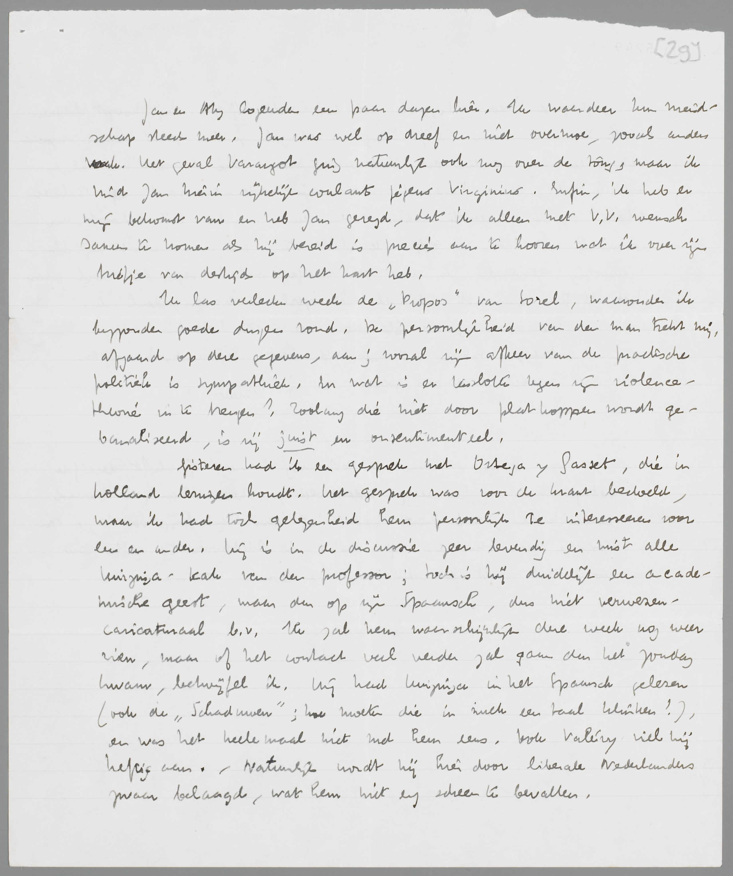 Gisteren had ik een gesprek met Ortega y Gasset, die in Holland lezingen houdt. Het gesprek was voor de krant bedoeld, maar ik had toch gelegenheid hem persoonlijk te interesseeren voor een en ander. Hij is in de discussie zeer levendig en mist alle Huizinga-kak van den professor; toch is hij duidelijk een academische geest, maar dan op zijn Spaansch, dus niet verwezen-caricaturaal b.v. Ik zal hem waarschijnlijk deze week nog weer zien, maar of het contact veel verder zal gaan dan het Zondag kwam, betwijfel ik. Hij had Huizinga in het Spaansch gelezen (ook de Schaduwen; hoe moeten die in zulk een taal klinken!), en was het heelemaal niet met hem eens. Ook Valéry viel hij heftig aan. Natuurlijk wordt hij hier door liberale Nederlanders zwaar belaagd, wat hem niet erg scheen te bevallen. ‘Konrad Merz’ logeerde ook een week bij ons. Hij hoopt binnen enkele maanden naar Parijs te gaan en zal je dan zeker komen opzoeken. Het is een erg aardige en intelligente man, die daarom natuurlijk ook in het Neue Tagebuch door zijn mede-emigrant Balder Olden op de gemeenste manier verscheurd werd. Hij behoort nu eenmaal niet tot de officieele litteraten, en dus wordt hij als nieuweling geweerd. Ik zond een stukje protest tegen dat vuil naar het N.T.B., maar het zal wel niet geplaatst worden, denk ik.