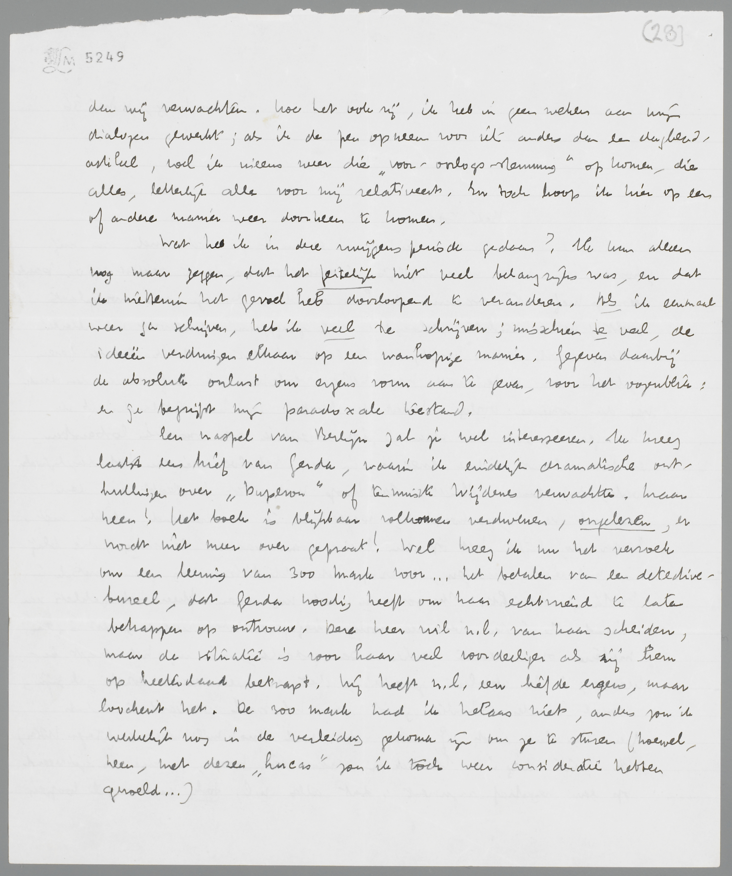 Een naspel van Berlijn zal je wel interesseeren. Ik kreeg laatst een brief van Gerda, waarin ik eindelijk dramatische onthullingen over ‘Duperon’ of tenminste Wijdenes verwachtte. Maar neen! Het boek is blijkbaar volkomen verdwenen, ongelezen, er wordt niet meer over gepraat! Wel kreeg ik nu het verzoek om een leening van 300 mark voor... het betalen van een detectivebureel, dat Gerda noodig heeft om haar echtvriend te laten betrappen op ontrouw. Deze heer wil n.l. van haar scheiden, maar de situatie is voor haar veel voordeeliger als zij hem op heeterdaad betrapt. Hij heeft n.l. een liefde ergens, maar loochent het. De 300 mark had ik helaas niet, anders zou ik werkelijk nog in de verleiding gekomen zijn om ze te sturen (hoewel, neen, met dezen ‘Lucas’ zou ik toch weer consideratie hebben gevoeld...). Jan en Aty logeerden een paar dagen hier. Ik waardeer hun vriendschap steeds meer. Jan was wel op dreef en niet overmoe, zooals anders vaak. Het geval Varangot ging natuurlijk ook nog over de tong, maar ik vind Jan hierin rijkelijk coulant jegens Virginius. Enfin, ik heb er mijn bekomst van en heb Jan gezegd, dat ik alleen met V.V. wensch samen te komen als hij bereid is precies aan te hooren wat ik over zijn trucje van destijds op het hart heb.